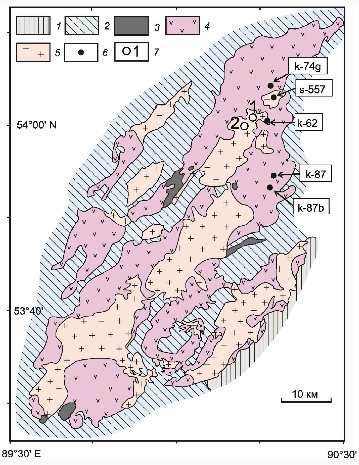 1 — вулканогенно-осадочные отложения (D1), 2 — карбонатные отложения (PR3–є). Магматические комплексы: 3 — когтахский габбро-монцодиорит-сиенитовый (є2), 4 — кашпарский габбро-диорит-кварцмонцодиорит-сиенитовый (є3–O1), 5 — тигертышский гранитоидный (є3–O1), 6 — пункты U-Pb изотопного датирования по цирконам с номерами проб см. ESM_1 (электронное приложение); 7 – цифрами показано местоположение: 1 — Сорского месторождения, 2 — участка Сор-Герет.