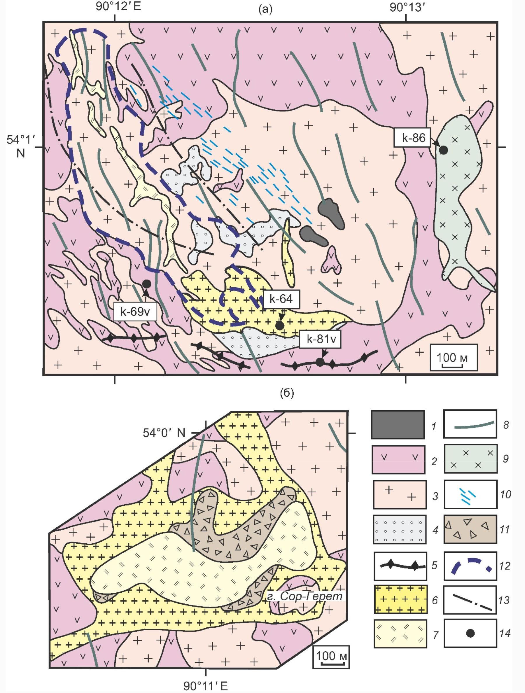 Магматиты Уйбатского плутона (1–3): 1 — габброиды, 2 — монцонитоиды, 3 — лейкограниты; 4 — калишпатовые метасоматиты; малые интрузии (5–7): 5 — предрудные дайки основного-среднего состава, 6 — гранит-порфиры I, 7 — гранит-порфиры II; интрузии раннего девона (8–9): 8 — дайки диабазов, 9 — шток кварцевых монцонит-порфиров; 10 — кварц-молибденитовые жилы; 11 — эксплозивные брекчии, 12 — контур брекчиевых руд; 13 — разломы; 14 — пункты изотопного U-Pb датирования по цирконам с номерами проб (см. электронное приложение ESM_1).