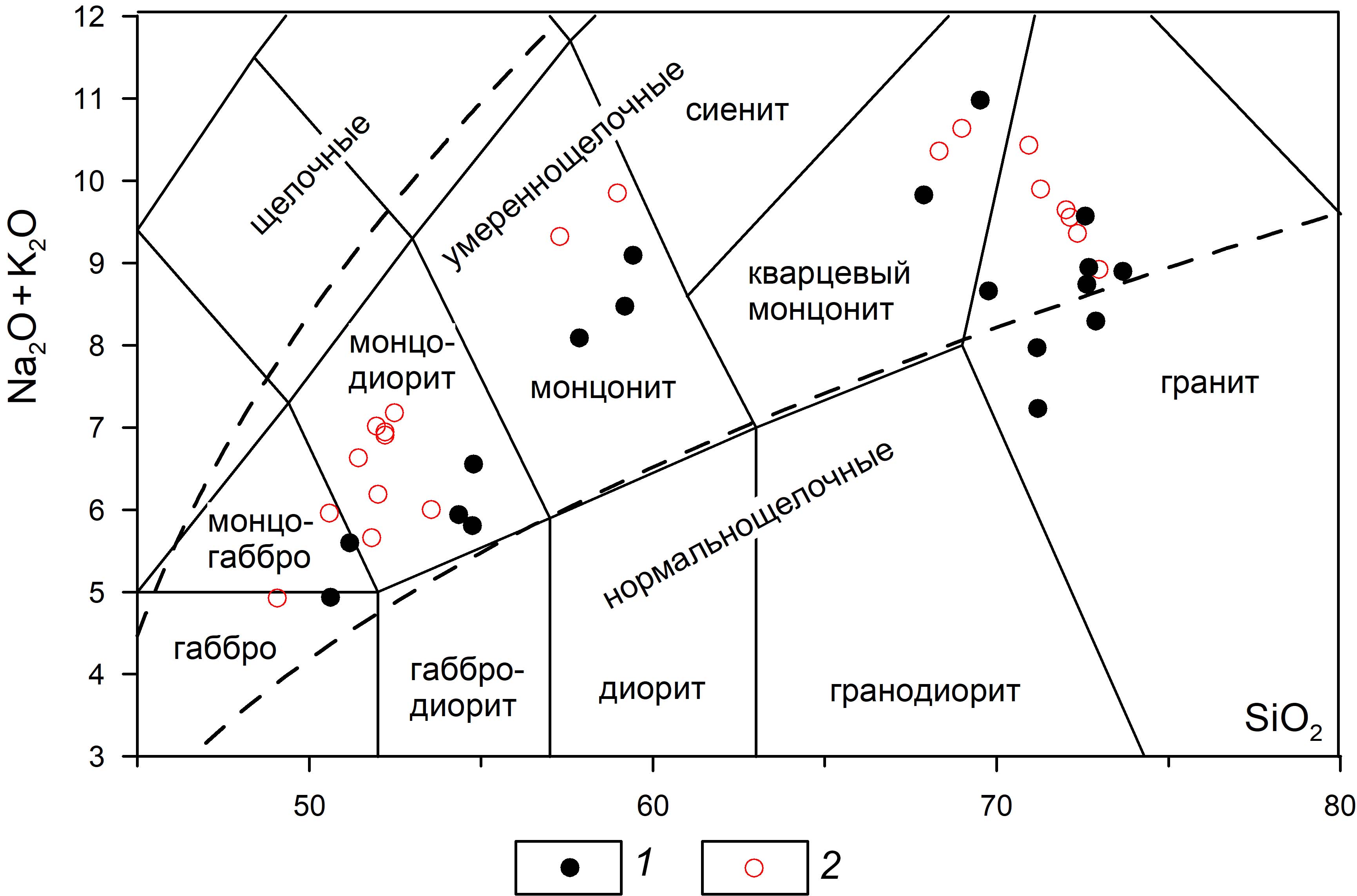 1, 2, магматические комплексы: 1 — плутоногенный, 2 — малых интрузий. Штриховыми линиями показаны границы серий по (Middlemost, 1997). Содержания оксидов (мас. %) пересчитаны на 100% сухого остатка.