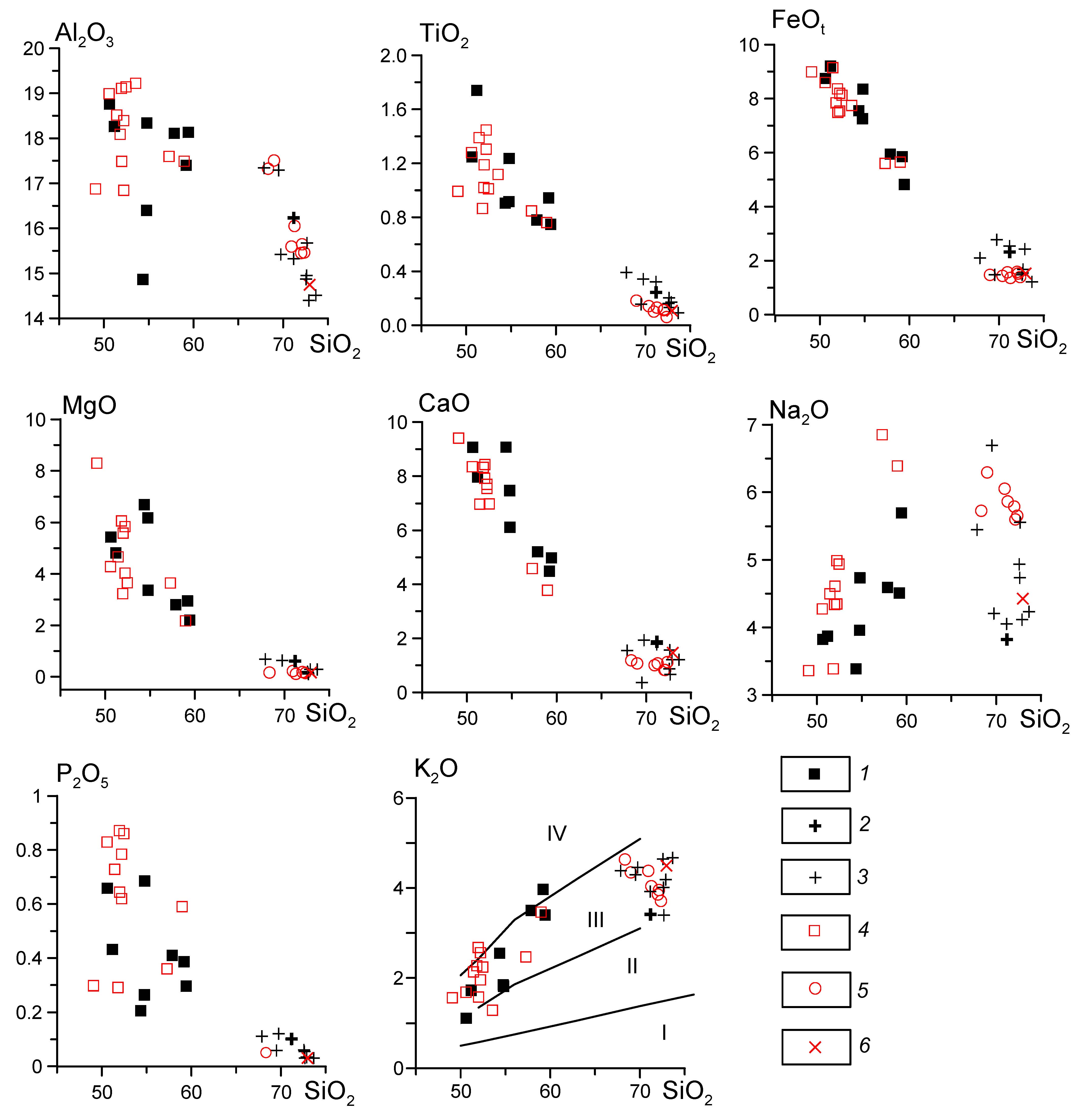 Уйбатский плутон (1–3): 1 — габбро, монцогаббро, монцодиориты, монцониты, 2 — крупнозернистый биотитовый гранит, 3 — лейкограниты; малые интрузии (4–6): 4 — габбро-, монцогаббро-, монцодиорит-порфириты, монцонит-порфиры, 5 — гранит-порфиры, 6 — пострудный мелкозернистый гранит. На диаграмме SiO2 — K2O поля магматических серий приведены по (Rickwood, 1989): I — толеитовой, II — известково-щелочной, III — высоко-K известково-щелочной, IV — шошонитовой.