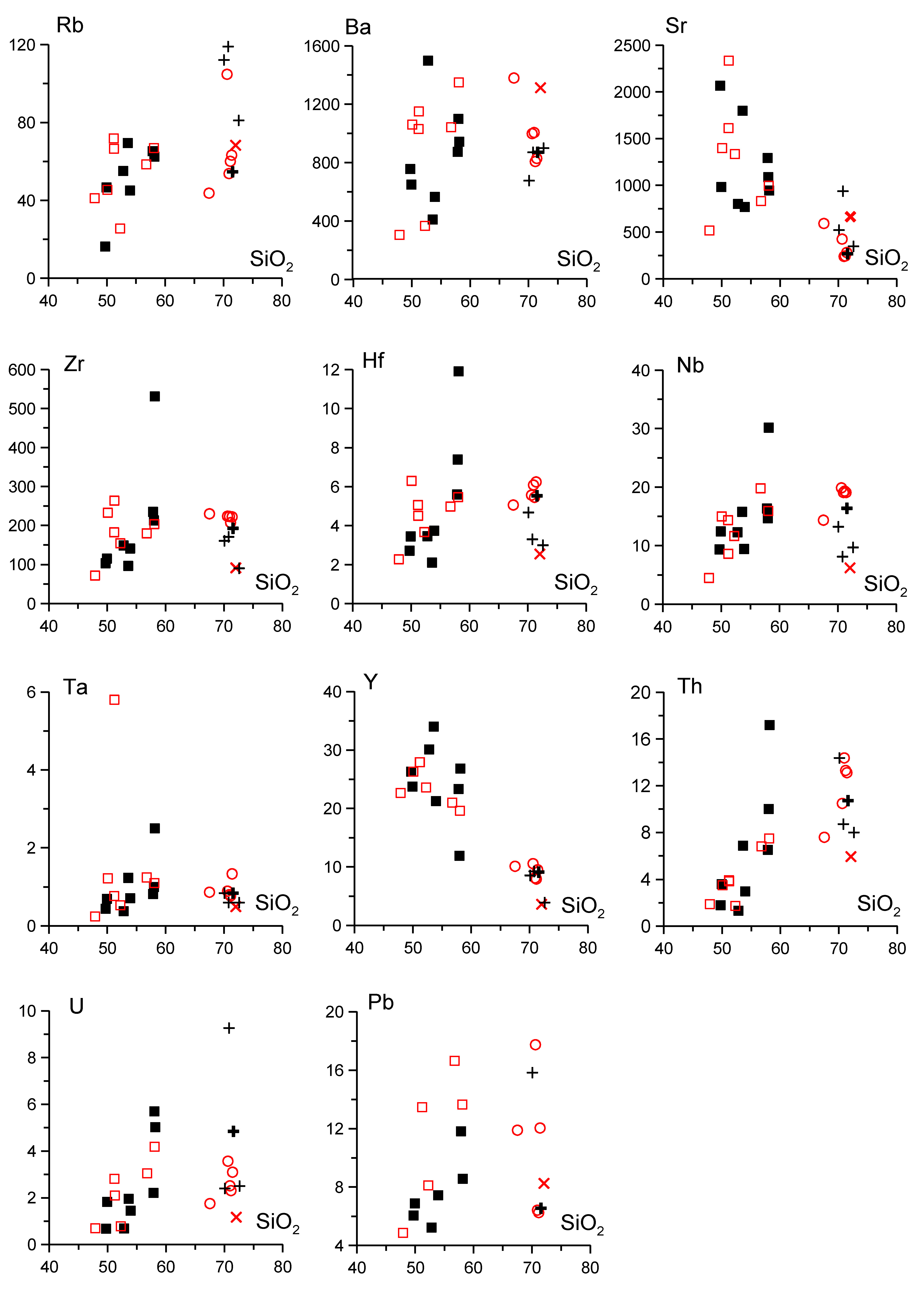 В целом содержания редких элементов однотипных пород плутона и малых интрузий близки (фиг. 5, ESM_2 (электронное приложение)). Габброиды и монцонитоиды плутона и малых интрузий характеризуются высокими содержаниями Sr и Ba и пониженными Rb. Общий интервал содержаний (г/т) Sr составляет 517–2333, Ba — 305–1498, Rb — 16–72. В лейкогранитах и гранит-порфирах содержания Sr не превышает 1000, Ba — 1380, а Rb повышается до 119 г/т. В целом содержания Zr, Hf и Nb в породах месторождения (за исключением образца k-87) варьируют (г/т) от 70 до 260, от 2.1 до 6.3 и от 4.5 до 19.9 соответственно, при этом их содержания в породах малых интрузий относительно плутона несколько повышены. Содержания Ta (за исключением двух образцов k-87 и k-81b) и Pb в породах плутона и малых интрузий близки. Для пород плутона характерен более широкий интервал содержаний U, при этом в среднем они незначительно повышены в сравнении с породами малых интрузий. Габброиды и монцонитоиды относительно гранитоидов обогащены Y и обеднены Th.