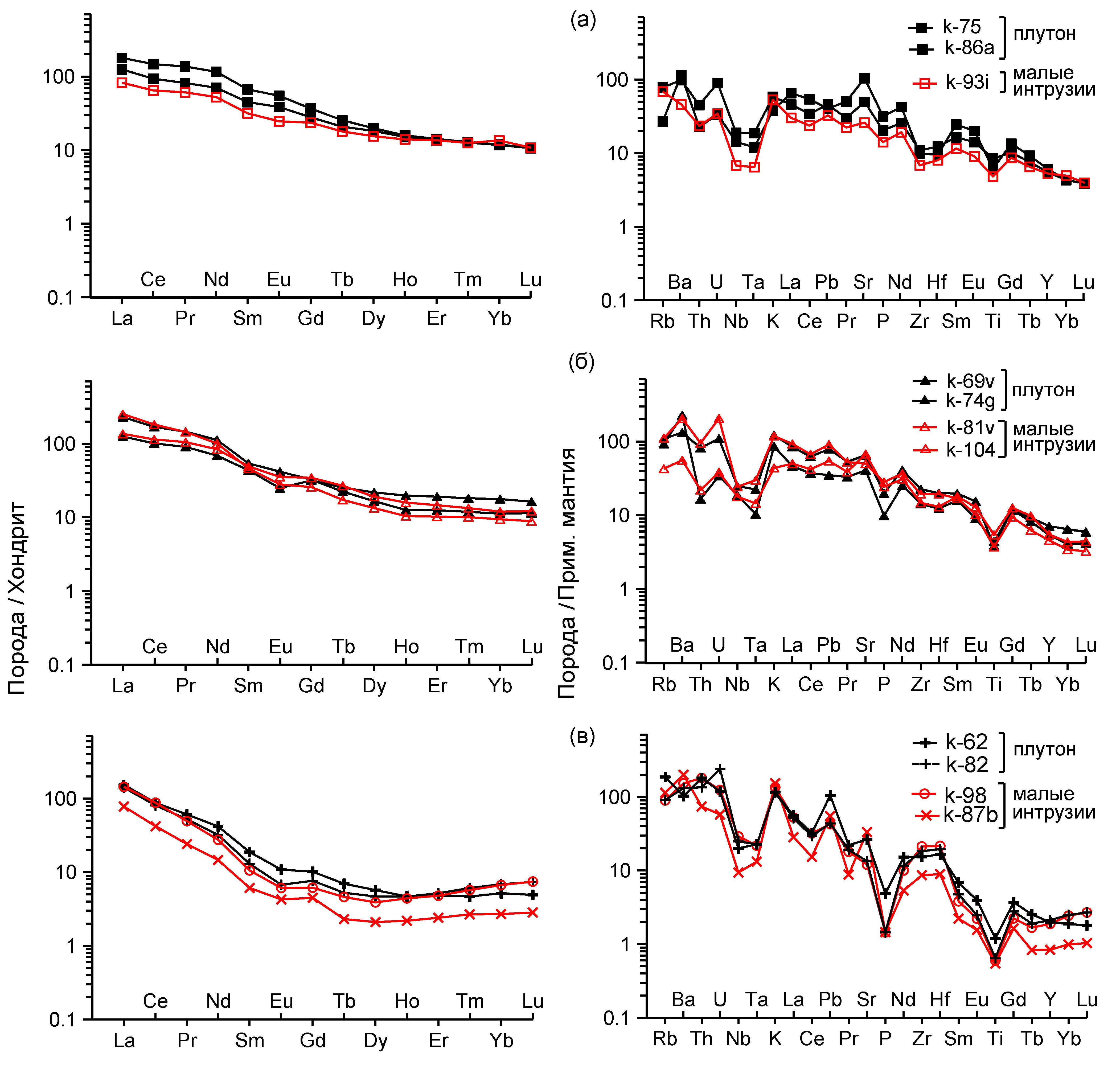Фиг. 7. Спектры распределения редкоземельных элементов и микроэлементов в породах Сорского рудного узла: а — габброидах, б — монцонитоидах, в — гранитоидах. Содержания REE и микроэлементов нормированы к хондриту и примитивной мантии соответственно (McDonough, Sun, 1995). Номера проб соответствуют приведенным в ESM_2 (электронное приложение).