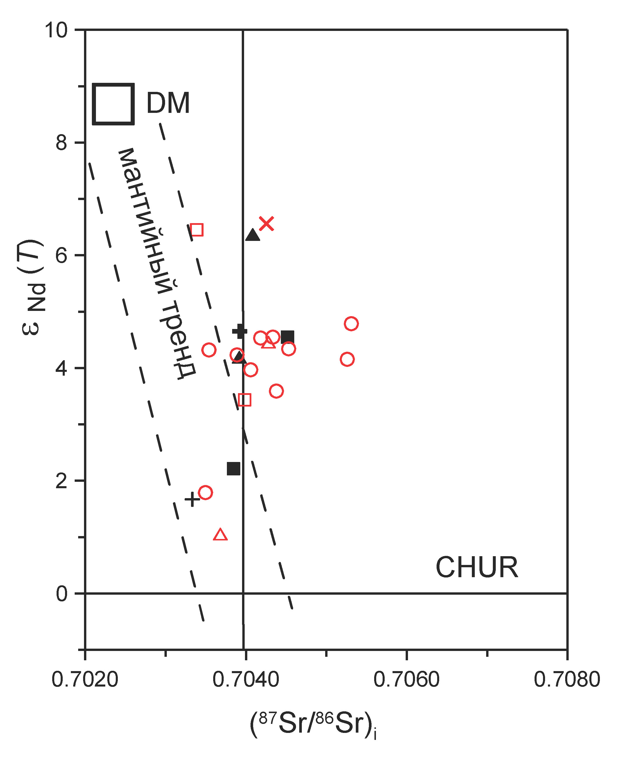 Фиг. 8. Диаграмма (87Sr/86Sr)i – eNd(T) для магматических пород Сорского рудного узла. Положение резервуаров: DM – деплетированная мантия (Liew, Hofmann, 1988; Rehkaemper, Hofmann, 1997), CHUR – однородный хондритовый резервуар (Jacobson, Wasserburg, 1984; Faure, 1986). Штриховыми линиями условно показан мантийный тренд. Усл. обозн. см. фиг. 6.