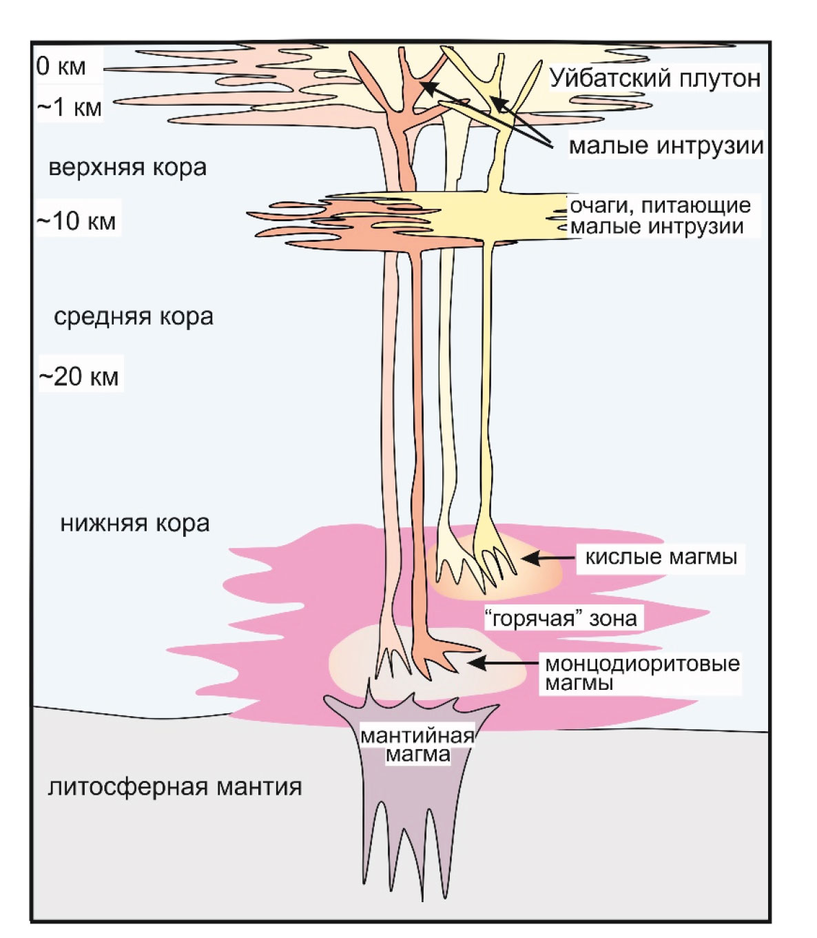Сорское Cu-Mo-порфировое месторождение расположено в Кузнецком Алатау, на северо-западе Алтае-Саянской складчатой области. Промышленное Cu-Mo оруденение тесно ассоциирует с малыми интрузиями (штоки, дайки) порфировых пород, локализованными в Уйбатском плутоне. Плутон и малые интрузии сложены породами габброидной, монцонитоидной и гранит/лейкогранитной ассоциаций. Однотипные породы плутона и малых порфировых интрузий близки по минеральному составу, металлогенической специализации, петрогеохимическим и изотопным характеристикам. Магматиты габброидной ассоциации являются производными плавления литосферной мантии, метасоматизированной субдукционными флюидами. Породы монцонитоидной ассоциации сформировались вследствие фракционной дифференциации мафической магмы и ассимиляции нижнекорового материала. Геохимические характеристики свидетельствуют об отсутствии генетической связи между породами повышенной основности и гранит/лейкогранитной ассоциации. По-видимому, породы гранит/лейкогранитной ассоциации кристаллизовались из расплава, сформировавшегося в результате частичного плавления ювенильной мафической коры под воздействием на нее тепла мафической магмы. Согласно U-Pb геохронологическим исследованиям, становление плутона произошло ~478, а внедрение малых интрузий от ~467 до ~457 млн лет назад. Предполагается, что породы плутона и малых интрузий генерировали расплавы разновозрастных средне-верхнекоровых очагов, формировавшиеся в связи с неоднократным поступлением магмы из глубинного крупнообъемного долгоживущего магматического резервуара. На месте раннего очага кристаллизовались породы Уйбатского плутона. Становление малых интрузий произошло на фоне многократного поступления магмы из позднего очага. На Сорском месторождении магматизм малых интрузий не является продолжением плутоногенного, как это часто отмечается на Cu-Mo-порфировых месторождениях. Связь магматизма плутона и малых интрузий опосредована через общий глубинный очаг. Внедрению малых интрузий предшествовало изменение тектонической обстановки, которое благоприятствовало подъему порфировой магмы, концентрированию и отделению флюидов и формированию богатого оруденения.