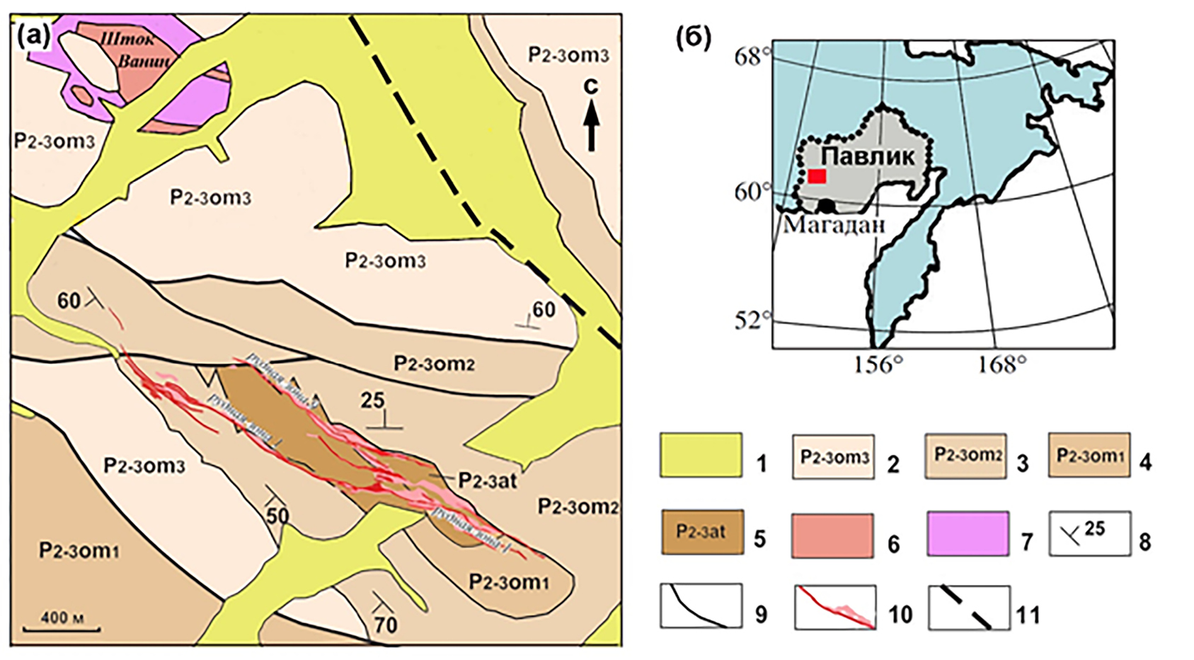 Фиг. 1. Геологическая карта золоторудного месторождения Павлик (а), составленная на основе (Троицкий, 2011ф1) и его административное положение (б). 1 – аллювиальные отложения; 2—4 – подсвиты омчакской свиты (переслаивающиеся аргиллиты, алевролиты, реже песчаники): 2 – третья подсвита, 3 – вторая подсвита, 4 – первая подсвита; 5 – атканская свита (неслоистые и неяснослоистые, гравийные, галечные, реже валунные диамиктиты); 6, 7 – эруптивные брекчии штока Ванин: 6 – риолитовые, дацитовые; 7 – андезитовые; 8 – элементы залегания пород; 9 – тектонические контакты; 10 – рудные зоны, контролируемые взбросо-сдвигами и взбросо-надвигами; 11 – Тенькинский глубинный разлом.