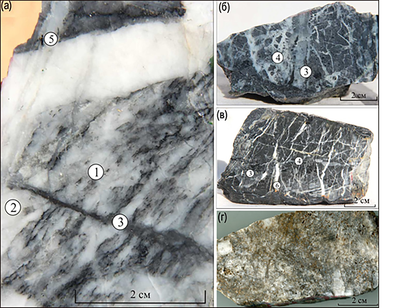 Фиг. 2. Типичные руды месторождения Павлик. а – ранняя жила кварца с реликтами углистого вещества (1) пересечена прожилком молочно-белого кварца с альбитом (2). Прожилок с серым кварцем и вкрапленностью арсенопирита (3) сечет со смещением (левый сдвиг или взброс) ранние прожилки и, в свою очередь, пересечен прожилком полупрозрачного “халцедоновидного” кварца с пустотками, выполненными гребенчатым кварцем (5). б – взаимоотношения между кварц-алевролитовыми брекчиями (4), продуктивным серым кварцем с арсенопиритом (3); в – прожилки продуктивного серого кварца с арсенопиритом (3 и 4) пересечены поздними прожилками и просечками кальцита (6), г – поздний кварц (шток Ванин), ксенолит в эруптивных риолитовых брекчиях.