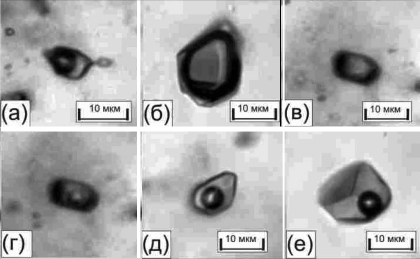 4. Fig. 3. Different types of fluid inclusions in quartz ore veins of the Pavlik deposit. a – carbon dioxide-aqueous inclusion of type 1; b – gas inclusion with low–density water vapor of type 2a; c, g – gas inclusions of type 2 with dense carbon dioxide (b +20oC, g –5oC); e, e - two-phase inclusions of aqueous salt solutions (d – primary, e – secondary).