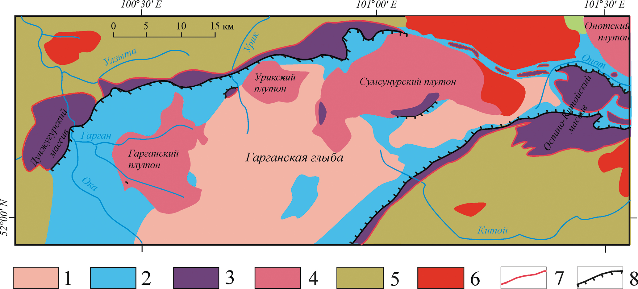 Фиг. 1. Упрощенная схема структурно-вещественных комплексов северо-восточного сегмента ЦАСП (по Kuzmichev, 2015). Условные обозначения: 1–2 Гарганская глыба: 1 – фундамент (AR-PR), 2 – чехол (>790 млн лет); 3 – офиолиты (MP3-PR2–3); 4 – Сумсунурские тоналиты (PR3); 5 – вулканогенно-осадочные породы (PR3); 6 – Сархойский комплекс, граниты (О1–2); 7 – тектонические контакты; 8 – надвиги.