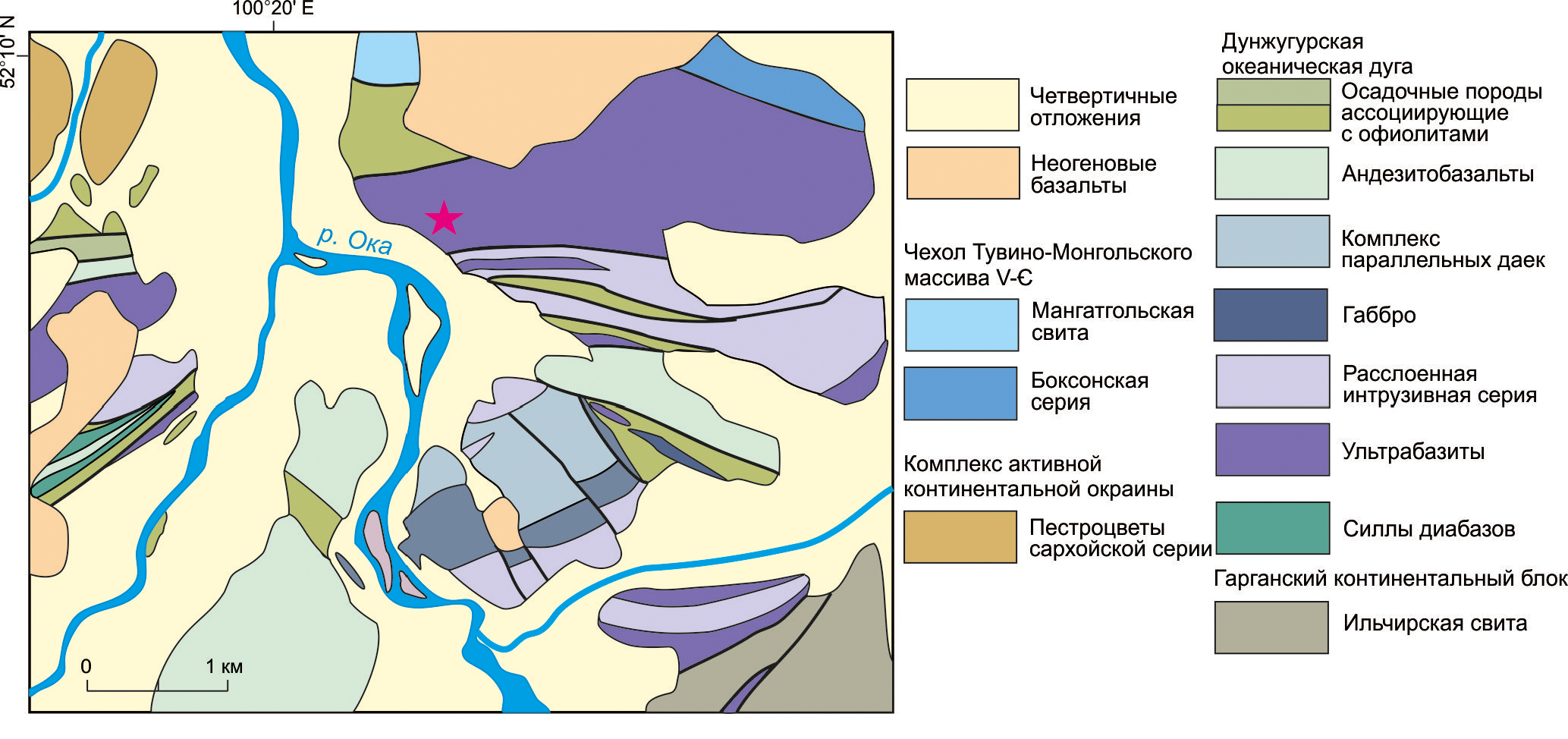 Дунжугурский офиолитовый комплекс, расположенный в юго-восточной части Восточного Саяна, входит в структуру Тувино-Монгольского террейна Центрально-Азиатского складчатого пояса (ЦАСП). ЦАСП состоит из амальгамированных террейнов от архейского до мезопротерозойского возраста (Dobretsov et al., 2003; Жмодик и др., 2006; Windley et al., 2007; Gordienko et al., 2021), которые были тектонически совмещены в период неопротерозойской аккреционной орогении (фиг. 1). Наиболее ранние этапы формирования ЦАСП связаны с развитием Палеоазиатского океана, открытого в ходе позднерифейского раскола суперконтинента Лавразия на Сибирский и Лаврентийский кратоны и ряд микроконтинентов (Dobretsov et al., 2003; Гордиенко и др., 2021). События континентального рифтинга, субдукции океанической коры и формирование окраинных бассейнов начались около 1000 млн лет назад и завершились примерно 570 млн лет назад (Windley et al., 2007).