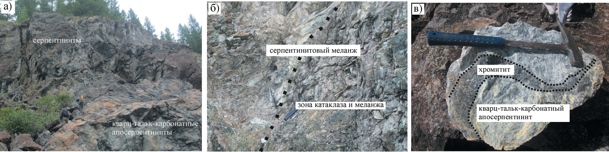 Фиг. 3. Фото обнажений площади на участке опробования: (а) выходы серпентинитов и кварц-тальк-магнезитовых апосерпентинитов; (б) зона тектонического меланжа – катаклазированные и меланжированные серпентиниты; (в) шлировидные обособления хромитита в кварц-тальк-магнезитовом апосерпентините.
