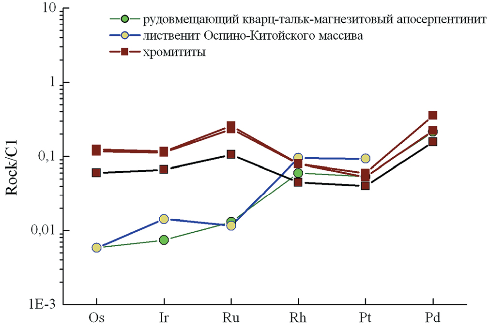 Фиг. 4. Распределение ЭПГ, нормированные на С1 (Naldrett, Duke, 1980) в рудовмещающем кварц-тальк-магнезитовом апосерпентините и хромититах Дунжугурского массива; лиственит Оспино-Китойского массива (Дамдинов, 2004).