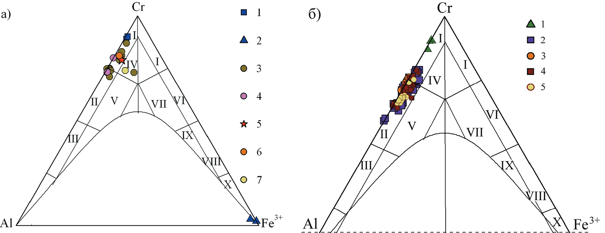 Фиг. 5. Классификационные диаграммы хромшпинелидов: (а) Дунжугурский офиолитовый массив: 1, 2 – хромшпинелиды и магнетиты из лиственитов и рудовмещающего кварц-тальк-магнезитового апосерпентинита, 1 – хромиты, 2 – каймы магнетита; 3 – рудные хромишпинелиды; 4 – рудные хромшпинелиды в парагенезисе с платинометальными фазами; 5 – хромит с включением селенида рутения; 6 – катаклазированные хромиты; 7 – реликты хромита в гематите; (б) рудные хромшпинелиды Оспино-Китойского офиолитового массива (Киселева и др., 2014; Kiseleva et al., 2017), Северная пластина: 1 – участок Харьх; Южная пластина, участки: 2 – Ильчирский, 3 – Змеевиковый, 4 – Хуша-Гол, 5 – хромититы из углеродизированных гипербазитов. На диаграммах поля составов построены по Н.В. Павлову (Павлов и др., 1968): I – хромит, II – алюмохромит, III – хромпикотит, IV – субферрихромит, V – субферриалюмохромит, VI – феррихромит, VII – субалюмоферрихромит, VIII – хроммагнетит, IX – субалюмохромагнетит, X – магнетит.