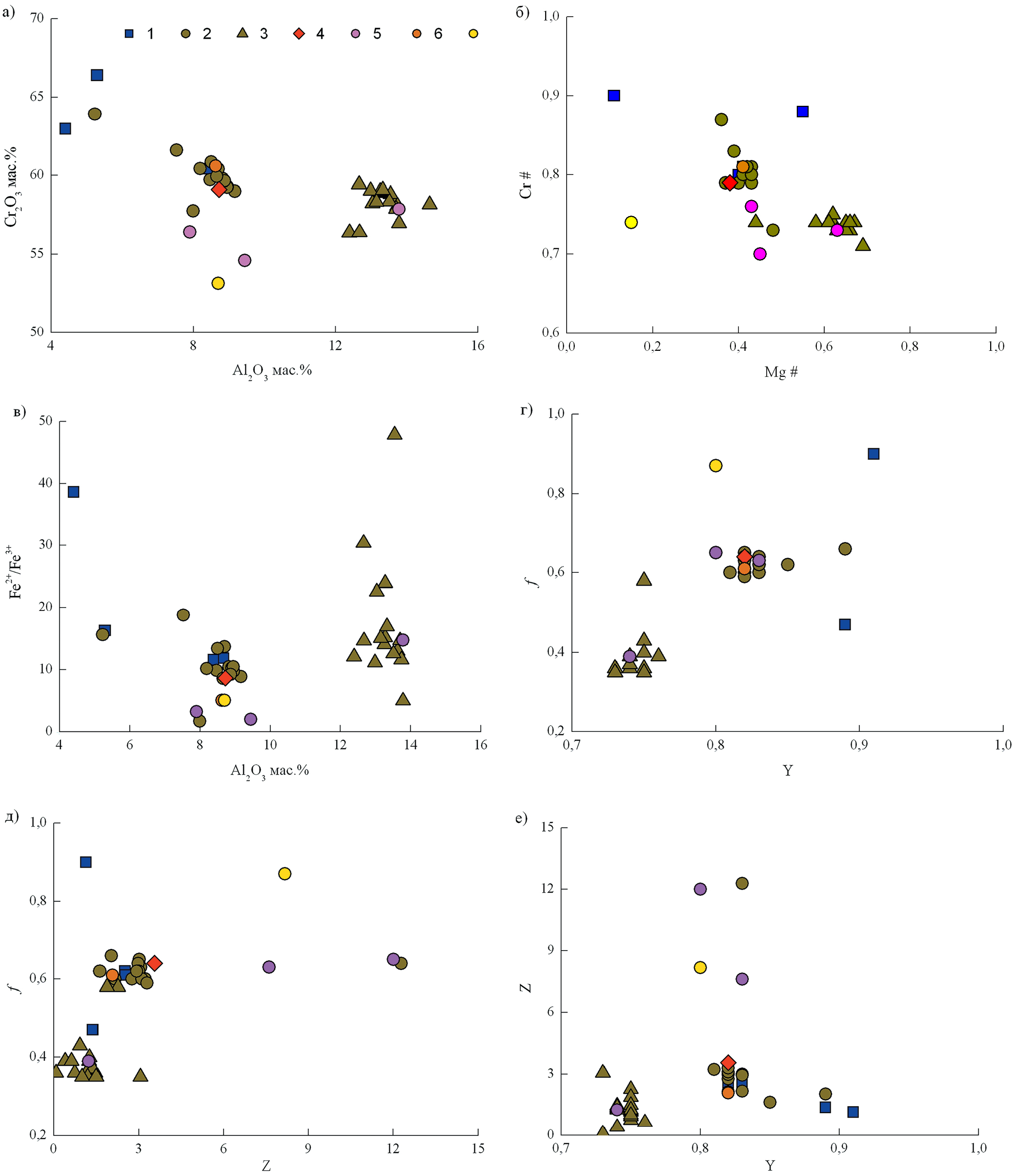 Хромшпинелиды в лиственитах имеют состав, соответствующий хромиту (в мас. %): 4–8.7 Al2O3, 59–67 Cr2O3, 16–29 FeO, 1–2.3 Fe2O3, 8–11 MgO, до 0.6 ZnO (фиг. 5а). Зерна по периферии и в участках трещиноватости замещаются магнетитом, редко гематитом.
