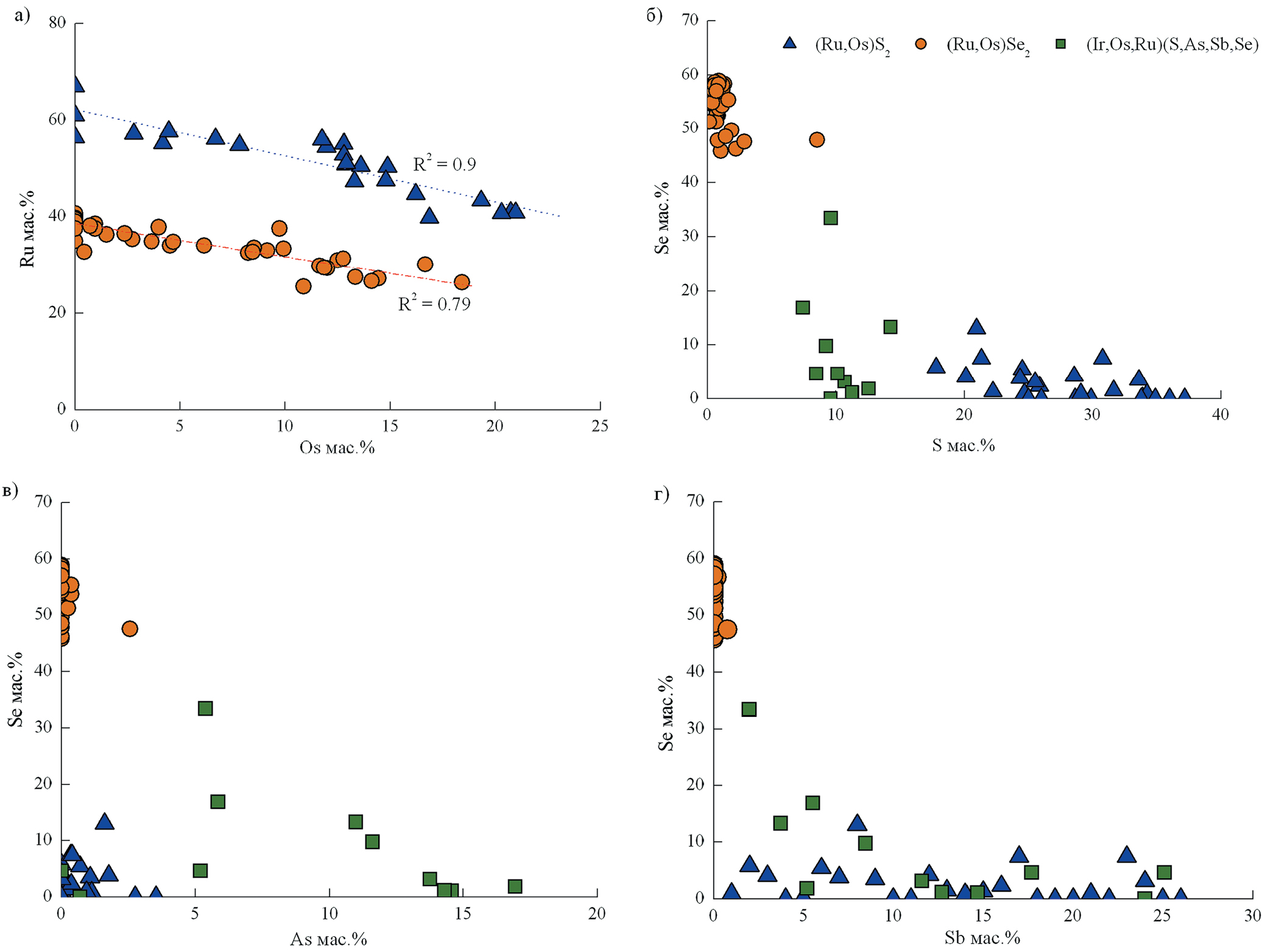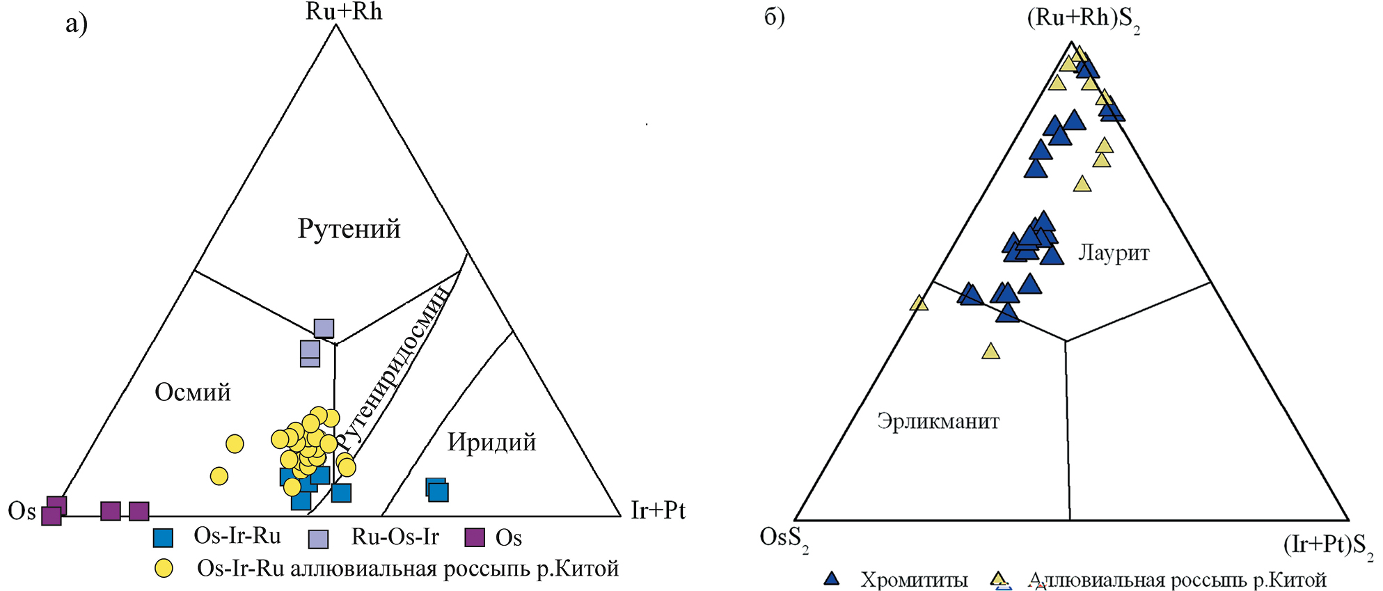Селениды платиновых элементов Ir-подгруппы в природных объектах чрезвычайно редки и установлены в россыпях, в том числе формирующихся за счет золоторудных объектов. В золотоносных россыпях реки Ауник (Западное Забайкалье) установлены селениды иридия c примесями Os, Te (Airiyants et al., 2020), в аллювиальных россыпях Западного Саяна (Куртушубинский офиолитовый комплекс) соединения Ir(As, Se, S)2 (Толстых и др., 1997), (Pt, Rh)(As, Se, S), PtSe2 (Barkov et al., 2018), в аллювиальных россыпях Восточного Саяна – селениды и селено-арсениды Ir-ЭПГ (Kiseleva et al., 2021; Airiyants et al., 2022).