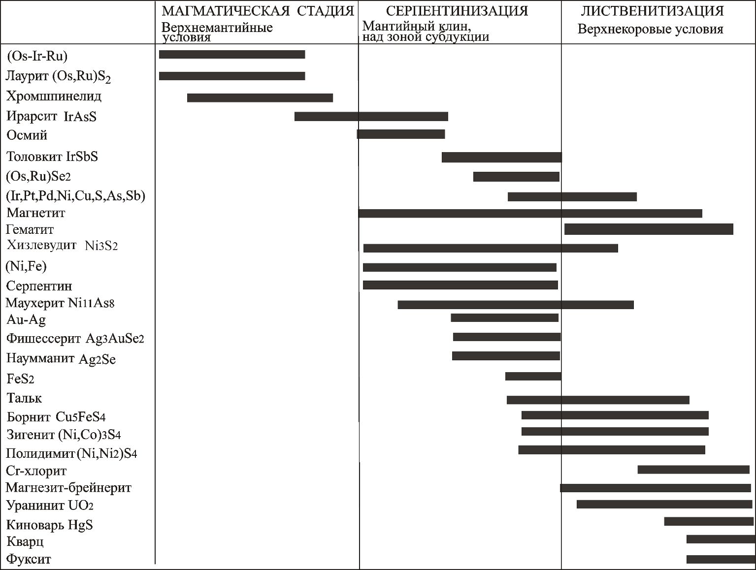 Os-Ir-Ru интерметаллиды, Ru-Os сульфиды ряда лаурит-эрликманит формировались раньше или близкоодновременно с хромшпинелидами в верхнемантийных условиях в супрасубдукционных обстановках.