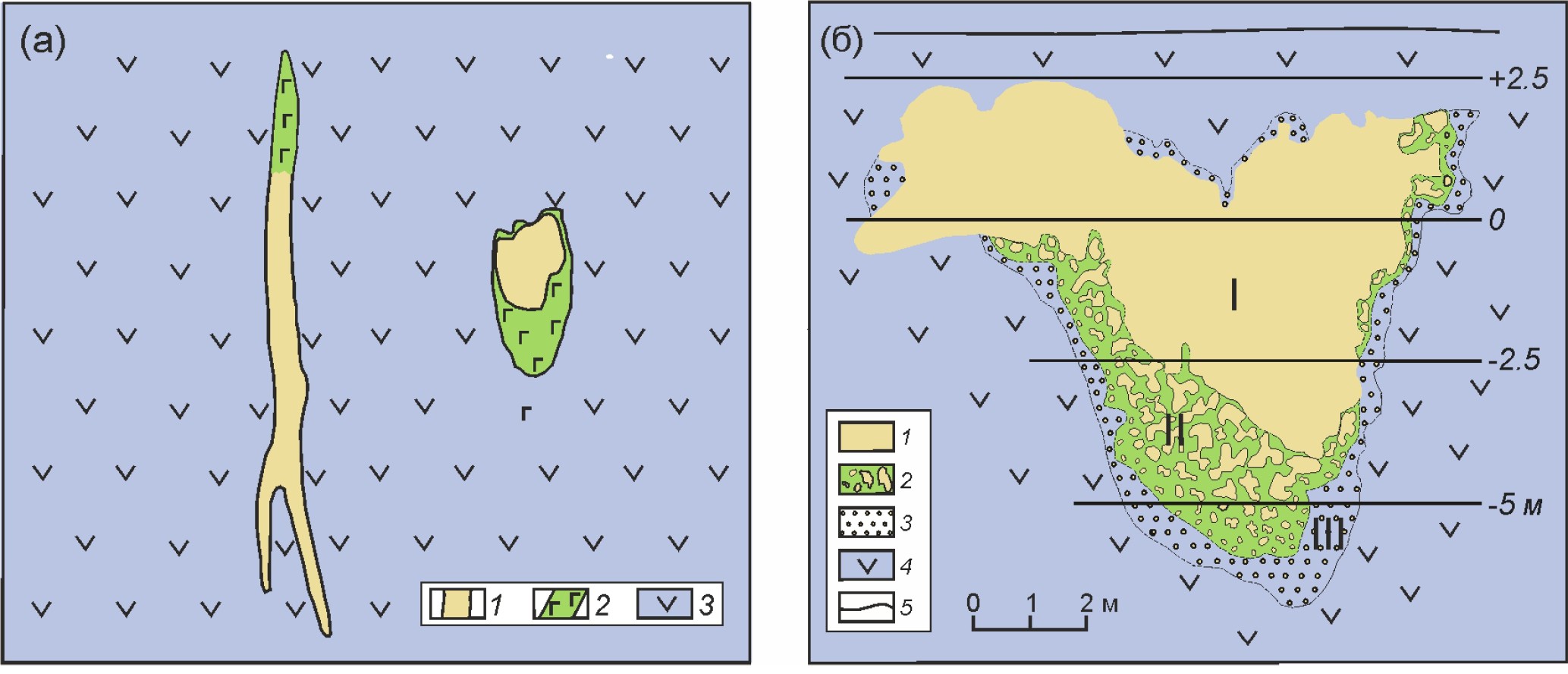 Фиг. 2. Примеры расположения сульфидного ЭПГ–Cu–Ni оруденения в телах рудных пегматитов, залегающих в жильном поле НКТ (а), и вертикальный разрез тела изученного рудного пегматита в направлении запад-восток (б). (а): 1 – сплошные сульфиды; 2 – габбронорит-пегматиты; 3 – вмещающие породы, ортопироксениты. Масштаб произвольный. (б): 1 – сплошные сульфиды (зона I); 2 – грубо- и гигантозернистые породы с крупными гнездами и вкрапленностью сульфидов (зона II); 3 – переход габбронорит-пегматита с вкрапленностью сульфидов в ортопироксенит (зона III); 4 – вмещающие породы, ортопироксенит; 5 – верхняя граница штрека. Горизонтальные линии – отметки высот. По данным: (а) (Шарков, 2006), (б) (Козлов и др., 1962) с изменениями.