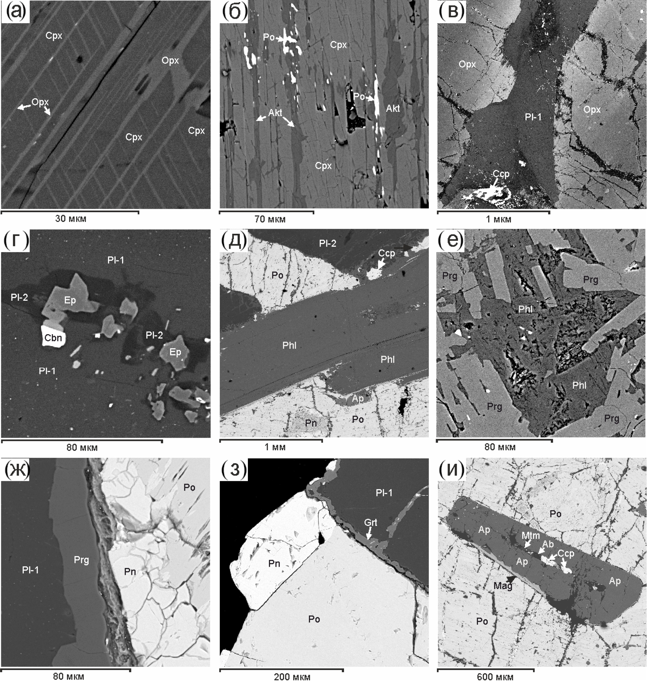 Фиг. 4. Взаимоотношения минералов в рудном пегматите. Электронный микроскоп, изображение в режиме обратно-рассеянных электронов (BSE). а – тонкие пластинки ортопироксена (Opx) в клинопироксене (Cpx), обр. 38-2; б – развитие актинолита (Akt) совместно с сульфидами по плоскостям спайности клинопироксена (Cpx); в – выделения плагиоклаза (Pl-1) с сульфидами в межзерновом пространстве кристаллов ортопироксена (Opx), в хлорит-карбонатных прожилках наблюдаются сульфиды; г – участок автометасоматического изменения, сложенный Pl-2, эпидотом (Ep) и кубанитом (Cbn), в раннем плагиоклазе (Pl-1); д – лейсты флогопита (Phl) в ассоциации с Pl-2, апатитом (Ap), пирротином (Po), пентландитом (Pn) и халькопиритом (Ccp); е – участок развития флогопита (Phl) и паргасита (Prg); ж – кайма паргасита (Prg) по границе между сульфидами и Pl-1; з – выделения граната (Grt) по краям кристалла Pl-1 на контакте с пирротином (Po) и пентландитом (Pn); и – кристалл апатита (Ap) c включениями альбита (Ab), магнезиотарамита (Mtm), халькопирита (Ccp) и каймой магнетита (Mag) на контакте с пирротином (Po). Символы минералов по (Whitney, Evans, 2010). а, б, в – обр. 38-2; г – обр. 38-5; д, и – обр. 38-13; е, ж, з – 38-7.