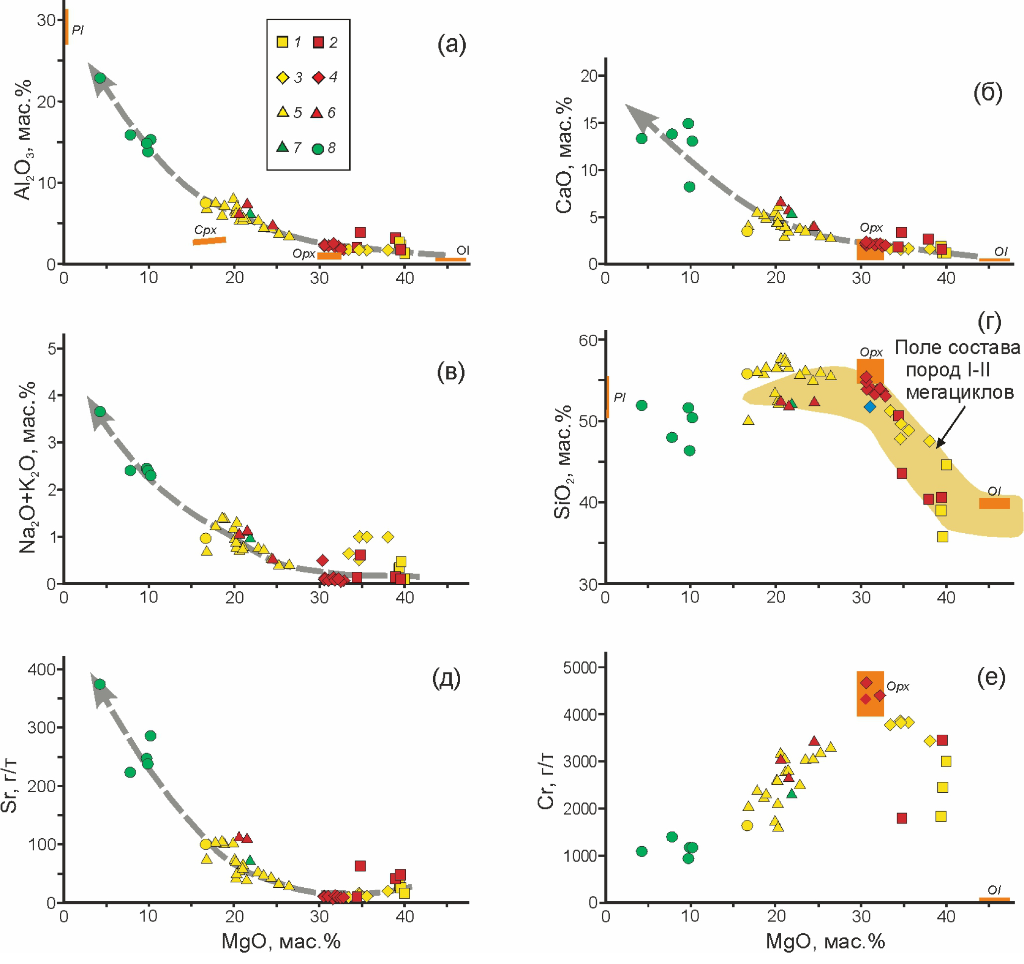 Сводный разрез плутона включает породы пяти мегациклов, каждый из которых начинается с пород, обогащенных Mg O. В пределах Северной камеры выделяются следующие мегациклы: I — гарцбургит-ортопироксенитовый и II — дунит-гарцбургит-ортопироксенитовый; в пределах Южной камеры: III — дунит-ортопироксенит-норитовый, IV — гарцбургит-норит-габброноритовый и V — габбронорит-анортозитовый. Выделенные мегациклы отражают последовательное внедрение порций магмы еще до полной кристаллизации пород предыдущего цикла, что сопровождалось размывом кумулатов или их брекчированием. На юго-западе от Мончеплутона залегают фрагменты подводящих палеоканалов. Один из таких палеоканалов в виде тела плагиогарцбургита, мощностью 340 м, было вскрыто структурной скважиной М-1 на глубине около 2.2 км (Смолькин и др., 2022; Smol’kin, Mokrushin, 2022).