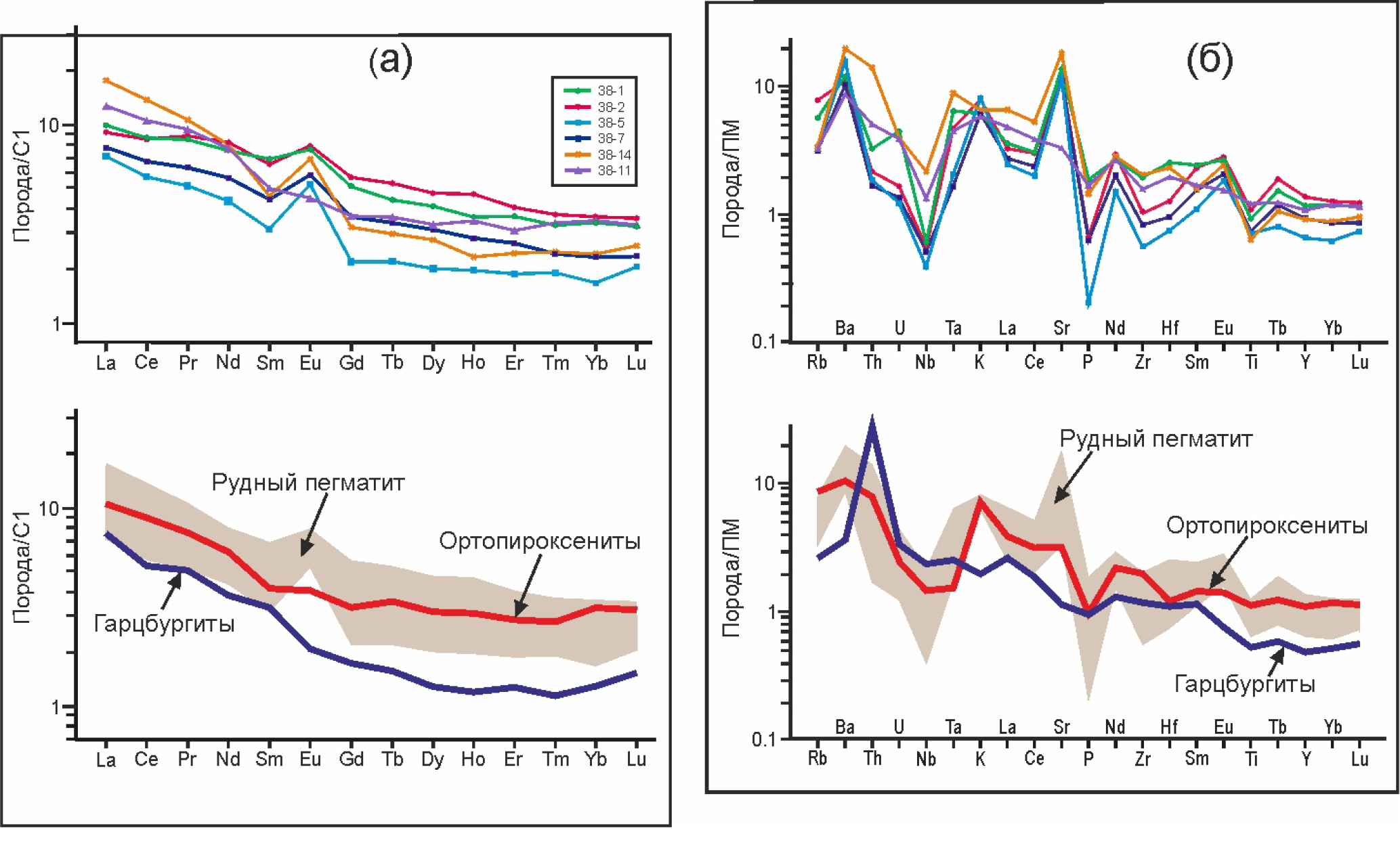 Примечание. 38-2, 38-5, 38-7 – габбронорит-пегматиты, 38-14 – лейкократовый габбро-пегматит, 38-11 – крупнозернистый ортопироксенит с вкрапленностью сульфидов; Opx-1 – ортопироксен крупных самостоятельных кристаллов, Opx-2 – тонкие пластинки в клинопироксене. En – энстатитовый, Fs – ферросилитовый и Wo – волластонитовый миналы в пироксенах.