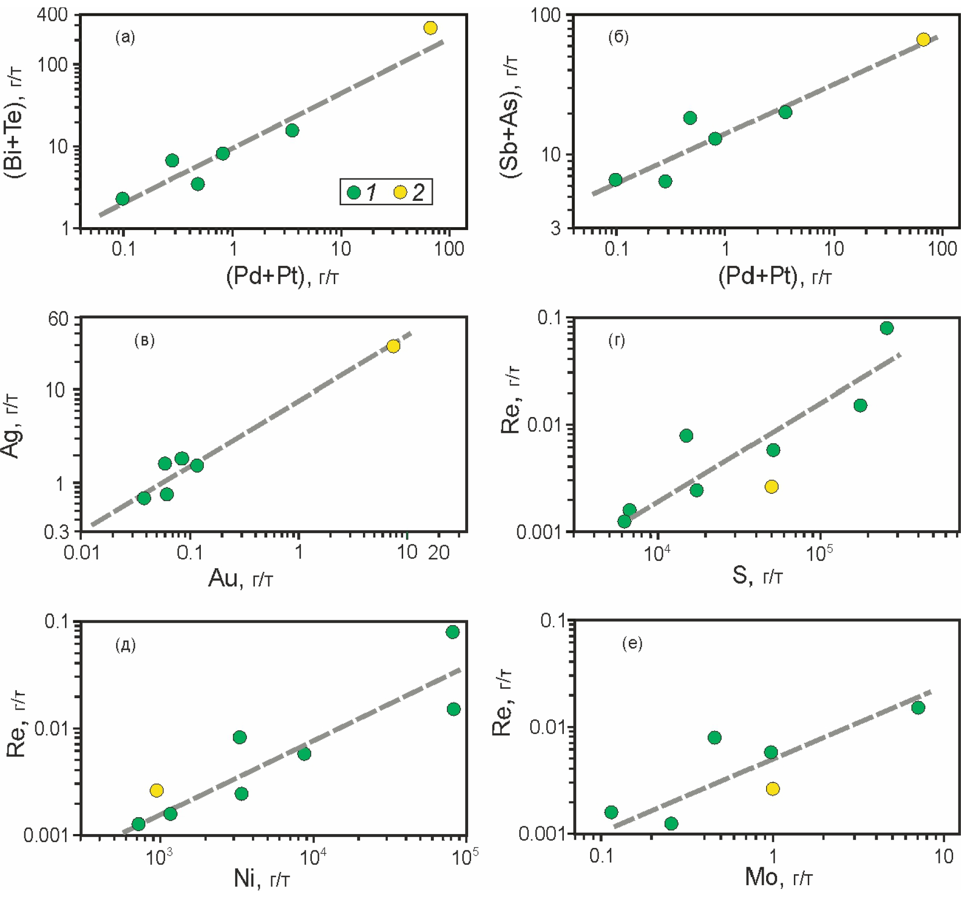 Содержания элементов платиновой группы (Pt, Pd, Rh, Ru, Ir, Os) и Re определены методом ICP-MS в ЦКП “Изотопно-геохимических исследований” ИГХ им. А.П. Виноградова СО РАН (Иркутск) на масс-спектрометре высокого разрешения Element 2 (Finnigan MAT) с использованием открытого кислотного разложения и отделением матричных элементов на катионите КУ-2—8 по методике (Меньшиков и др., 2016). Правильность определения концентраций и дрейф прибора контролировали по стандартным образцам Ж-3, РП-1 (Ru, Rh, Pd, Pt, Ir) и ЕСО-2 (Pd, Pt), также Jp-1 (Япония), DZE-1 (Китай) — (Ru, Rh, Pd, Pt, Ir). Значения пределов обнаружения, рассчитанные с учетом величины контрольного опыта и его стандартного отклонения (при переведении навески 1 г в 50 мл), составили (нг/г): для Ru — 0.5, Rh — 0.7, Pd — 4.0, Re — 0.2, Os — 0.8, Ir — 0.1, Pt –0.7. Относительные ошибки, полученные при измерении стандартов, не превышают 10%. Несколько проб были проанализированы для контроля на Pt и Pd в ЦКП “Геоспектр” ГИН СО РАН атомно-эмиссионным спектральным анализом. Полученные данные показали удовлетворительную сходимость с результатами метода ICP-MS.