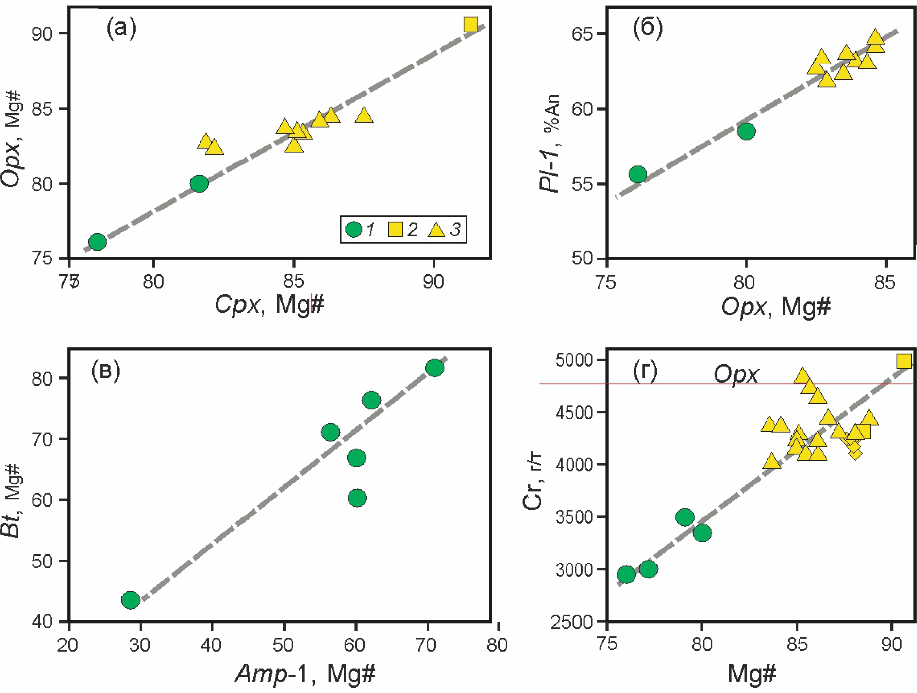 Здесь и в табл. 2, 3 и 7 в скобках указано количество проанализированных зерен, использованных для расчета среднего состава; прочерк – элемент не обнаружен (ниже предела чувствительности анализа). Mg# (магнезиальность) – 100 Mg/(Mg + Fe2+ + Mn), * – общее железо в виде FeO.