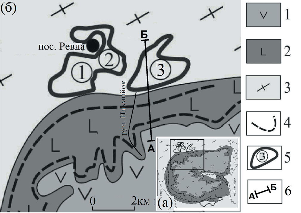 Фиг. 1. Геологическое строение со снятыми четвертичными отложениями и лопаритовая минерализация части Ловозерского массива: а – обзорная схема массива, б – фрагмент северо-восточний части массива (Лихачев и др., 19801; Лаломов и др., 2019). 1 – эвдиалитовые луявриты нерасчлененные; 2 – дифференцированный лопаритоносный комплекс луявритов-фойяитов-уртитов; 3 – вмещающий докембрийский гранито-гнейсовый комплекс; 4 – рудные зоны массива; 5 – Ревдинское редкометальное россыпное месторождение (поле), оконтуренное по содержанию 4 кг/м3; участки: 1 – Шомиокский, 2 – Ревдинский, 3 – Сергеваньский; 6 – разрез по линии АБ, фиг. 2.