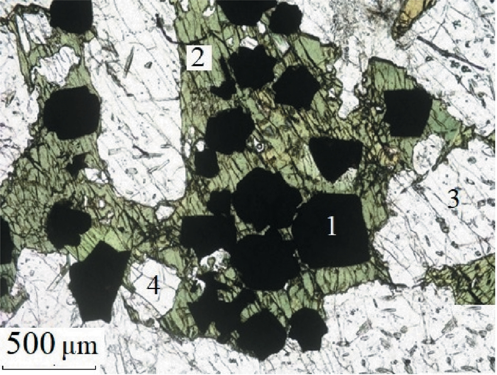 Фиг. 3. Лопарит-1 в малиньите из промышленной рудной зоны массива (прозрачный шлиф). 1 – лопарит, 2 – эгирин, 3 – нефелин, 4 – полевой шпат (по материалам авторов).