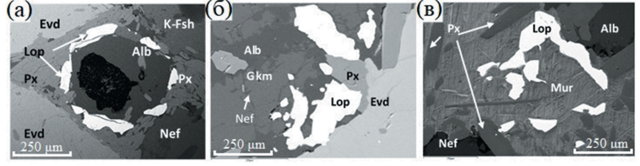 В отобранной пробе продуктивного пласта Сергеваньской россыпи размерный класс более 0.8 мм составляет 42.6 вес. %. Класс более 10 мм представлен плохо окатанной галькой и щебнем пород Ловозерского массива — преимущественно нефелиновыми сиенитами, эвдиалитовыми и мурманитовыми луявритами. Лопарит выявлен, в основном, в двух последних типах пород в виде включений. Он представлен в породах преимущественно в виде скелетных форм и ксеноморфных выделений в межзерновом пространстве породообразующих минералов. Скелетные формы (фиг. 4а) выделяются в ассоциации с пироксенами, эвдиалитом, нефелином и калиевым полевым шпатом, внутренняя часть выполнена альбитом с мелкими включениями эгирин-авгита; ксеноморфные выделения лопарита (фиг. 4б) отмечаются в межзерновом пространстве нефелина (практически полностью замещенного гакманитом (содалитом) и сохранившегося только в виде тонких просечек в гакманите), эвдиалита (в срастании с пироксенами) и альбита, а также в поле развития мурманита (фиг. 4в), заместившего ломоносовит, по периферии поля мурманита располагаются очаговые выделения нефелина, альбита и редкие кристаллы пироксенов. Аналогичные (фиг. 4а) полифазные включения в сдвойникованных идиоморфных кристаллах лопарита встречаются в рудных ийолитах (Пахомовский и др., 2014).