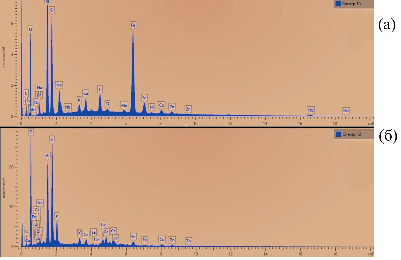 Фиг. 6. Энерго-дисперсионные спектры примазок на зернах лопарита.
