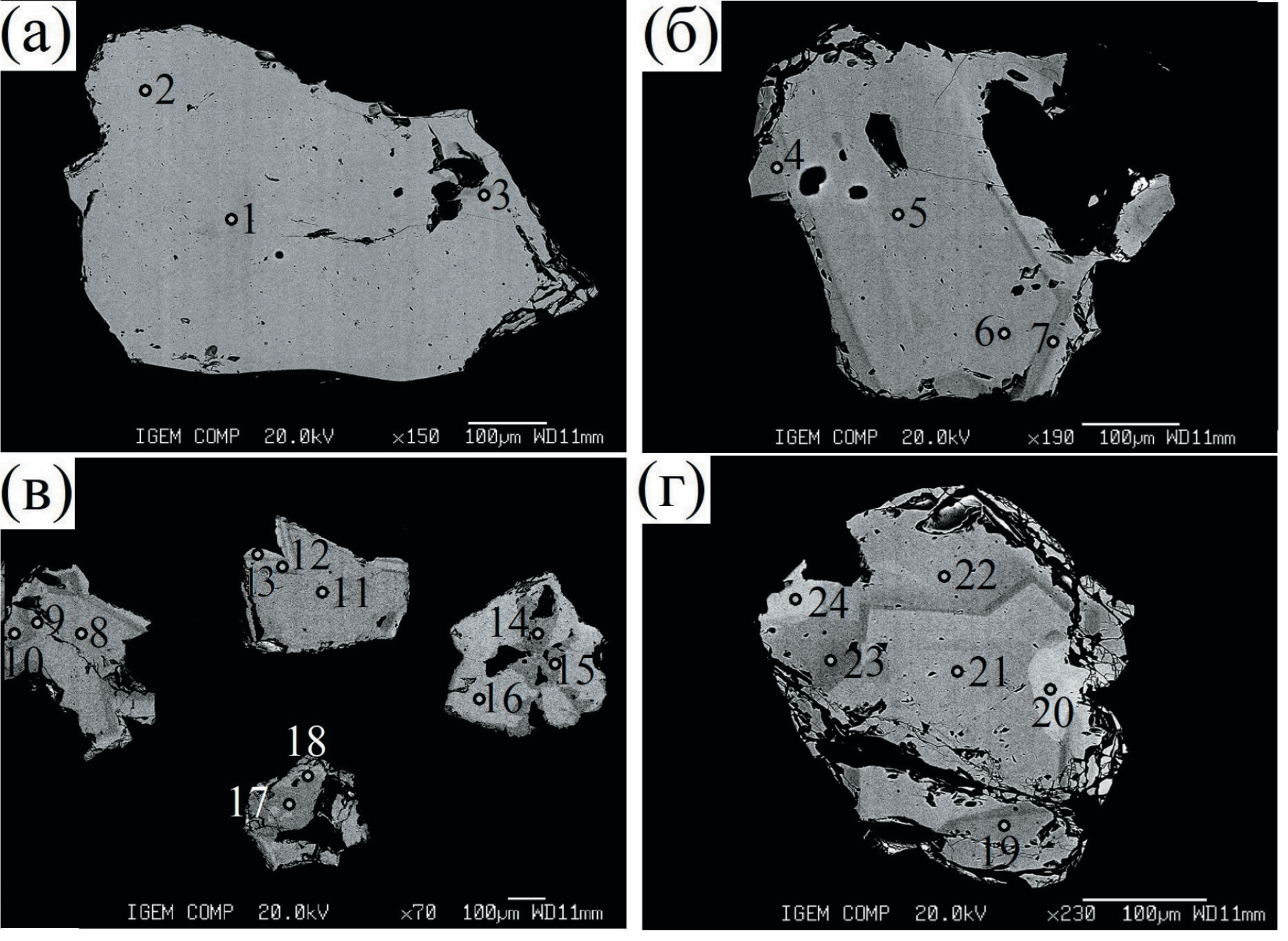 Во внутренней структуре зерен лопарита-1 наблюдается зональность (ширина зон варьирует от 20 до 100 мкм), выраженная изменением химического состава: более темные в BSE участки зерен содержат меньшее количество ниобия и стронция и, наоборот, светлые части обогащены этими элементами (фиг. 7, Приложение 1). Фигура 7а — зерно наиболее однородное, отмечаются только небольшие, более темные, участки в центре зерна, содержащие несколько меньшие количества Sr и Nb; фиг. 7б — зональное зерно, где по периферии кристалла образуется зона, обедненная тяжелыми элементами (темная кайма); фиг. 7в и г — кристаллы с концентрической зональностью — чередованием темных и светлых участков, располагающихся по кристаллографическим граням, причем в последнем случае видно наложение вторичной зональности (светлое пятно, в центре которого выполнен анализ, точка 20).