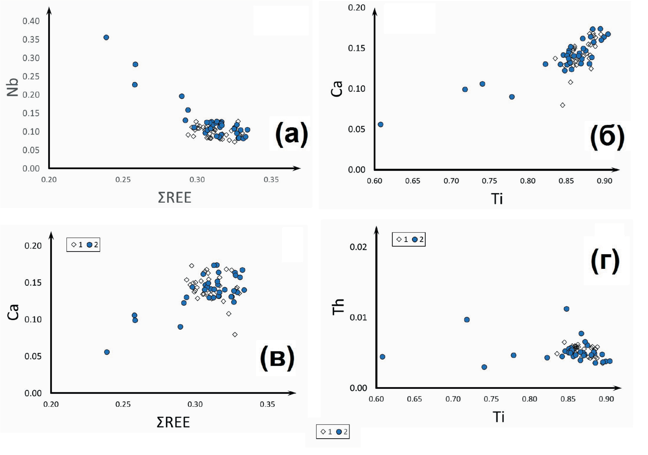 Фиг. 8. Соотношения содержаний некоторых основных компонентов в лопарите, в формульных единицах. a – ниобий от суммы РЗМ, б – кальций от титана, в – кальций от суммы РЗМ, г – торий от титана. 1 – лопарит-1, 2 – лопарит-2.