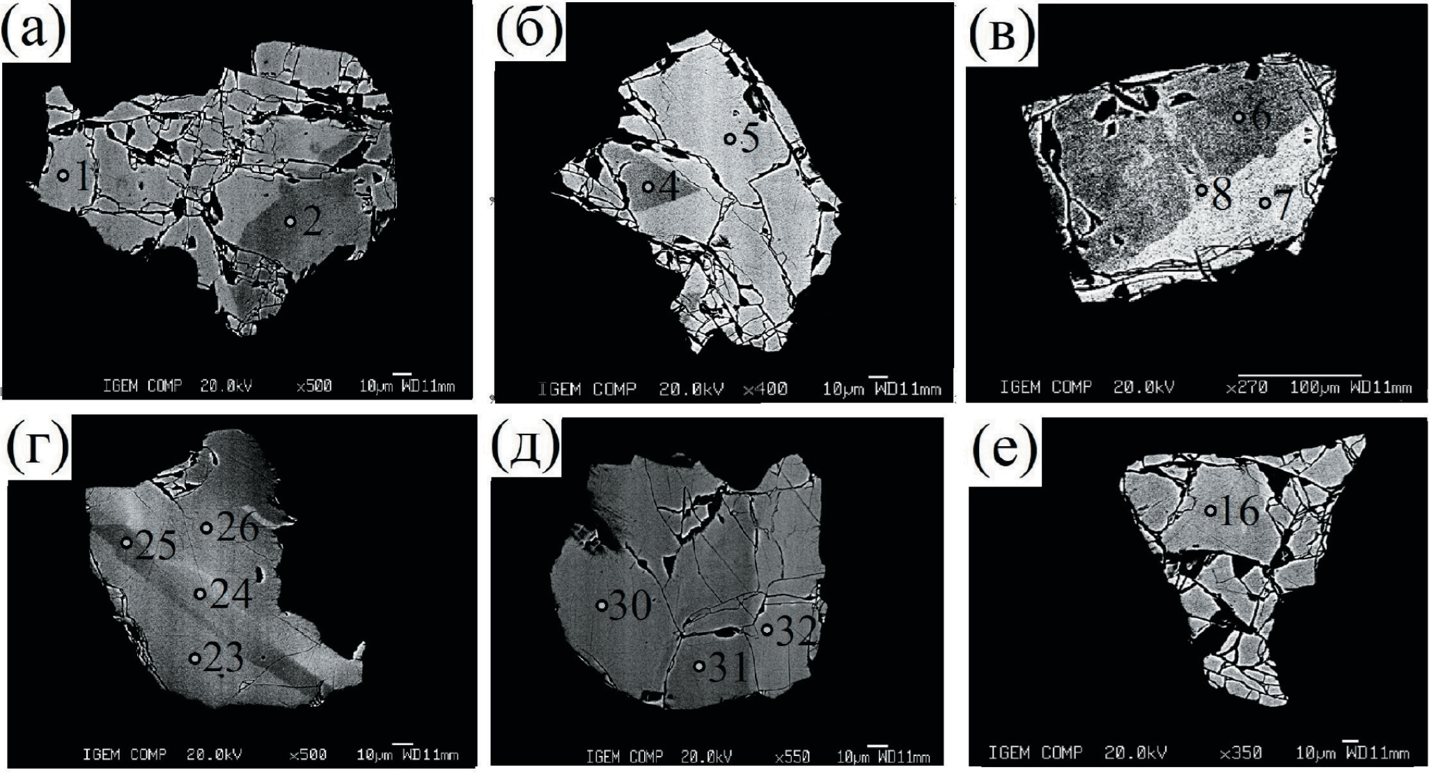 Фиг. 7. Внутреннее строение зерен лопарита-1 в россыпи по данным РСМА, цифры на рисунке соответствуют №№ анализов в Приложении 1. Изображение в отраженных электронах. Полированная шашка.