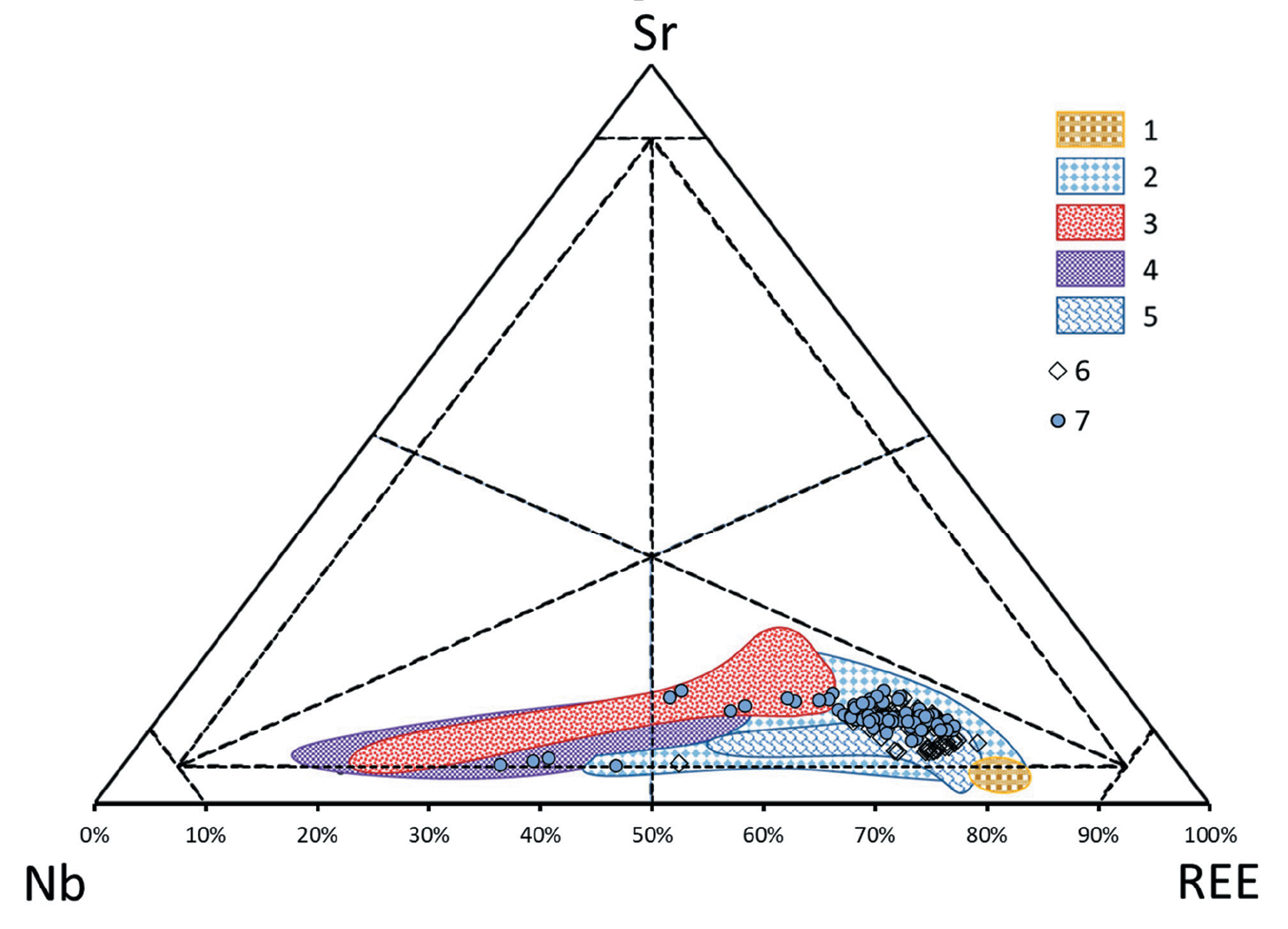 Фиг. 11. Сравнительная диаграмма состава лопарита Сергеваньской россыпи и из коренных пород Ловозерского массива. Области составов лопарита из массива – обобщение наших и литературных данных (Сук и др., 2012; Chakhmouradian, Mitchell, 2002; Михайлова и др., 2018; Пахомовский и др., 2014; Mitchell, Chakhmouradian, 1996): 1 – пойкилитовые содалитовые и нозеановые сиениты; 2 – дифференцированный комплекс уртитов-фояитов-луявритов; 3 – комплекс эвдиалитовых луявритов; 4 – мурманитовые порфировидные луявриты; 5 – пегматиты; 6, 7 – составы лопарита из россыпи: 6 – лопарит-1, 7 – лопарит-2.