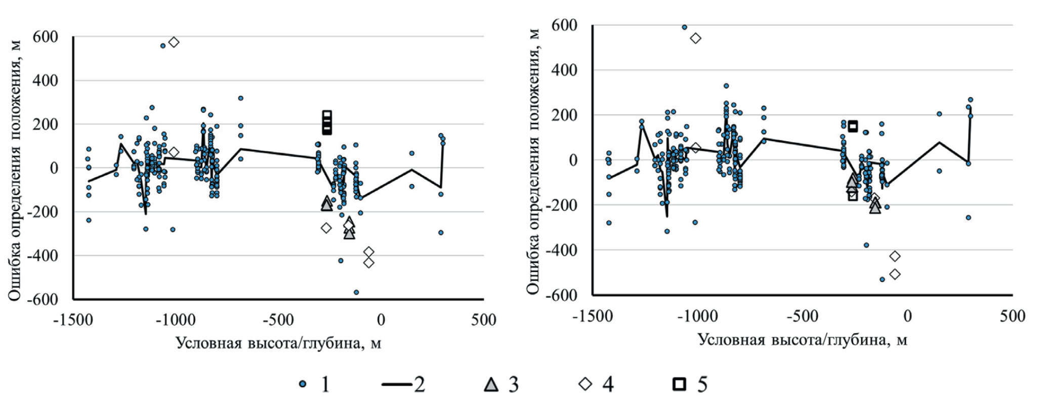 Фиг. 12. Распределение ошибок определения высоты в зависимости от истинного положения образца в разрезе Ловозерской интрузии по первой (а) и второй (б) формулам. 1 – по единичным анализам (Kogarko et al., 2002); 2 – усреднение по образцам; 3 – по (Пахомовский и др., 2014); 4 – новые данные по лопаритовому малиньиту; 5 – по (Михайлова и др., 2023)