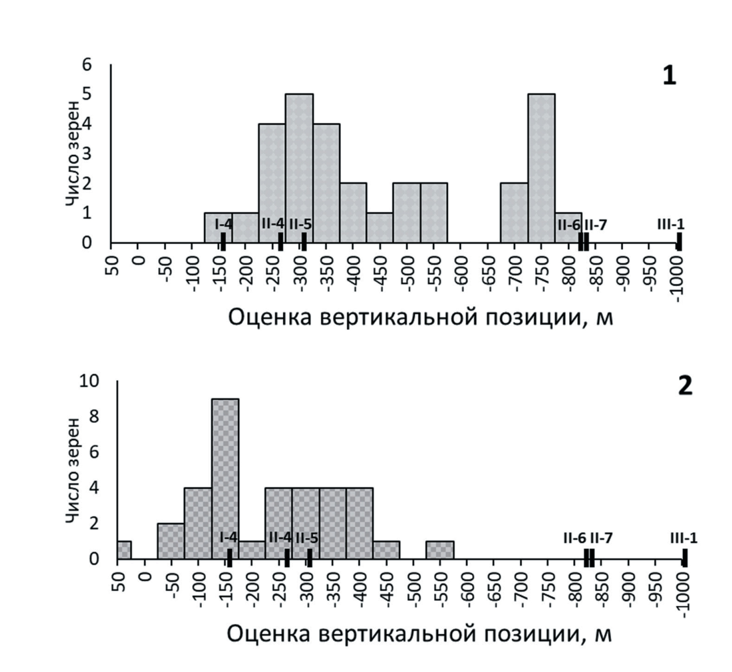 Фиг. 13. Распределение зерен лопарита из россыпи по оценке вертикальной позиции источника (высотные отметки уровней от границы с эвдиалитовым комплексом). 1 – лопарит-1, 2 – лопарит-2. Черные отметки на осях показывают положение маркирующих горизонтов.