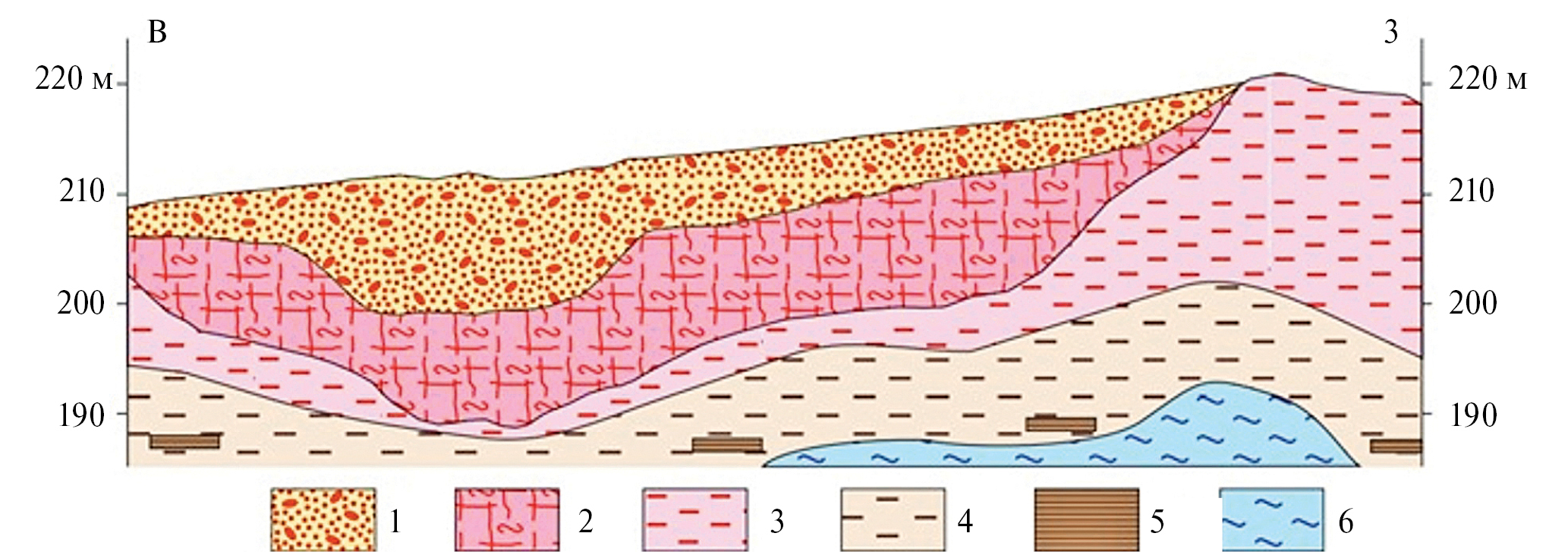 Фиг. 1. Схематическое расположение генетических типов бокситов в бокситоносном профиле коры выветривания: 1 – осадочно-латеритные, 2 – инфильтрационно-метасоматические, 3 – латеритные (in situ), 4 – железистые латериты, 5 – ферриплантиты, 6 – материнские породы.