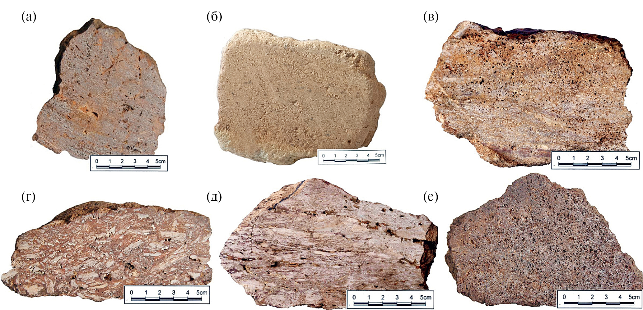Псевдоморфные бокситы характеризуются тонкой полосчатостью, унаследованной от первичной слоистости алевро-аргиллитов (фиг. 2а, е). Бокситы, образованные по массивным аргиллитам, обладают менее выраженной полосчатостью при равномерной мелко-скрытокристаллической структуре. Размеры зерен минералов в обломках позволяют судить о типе замещенных исходных коренных пород. Гематит слагает удлиненные зерна, образующие равномерную, реже неравномерную вкрапленность в породе (фиг. 2д). По массивным песчаникам развиты псевдоморфные бокситы и латериты (фиг. 2б). Цвет бокситов может меняться в зависимости от содержания в них железа от почти белых (фиг. 2в) и розовых до коричнево-красных (фиг. 2г) и даже лилово-красных (за счет гематита) в разновидностях с высоким содержанием железа (фиг. 2д).