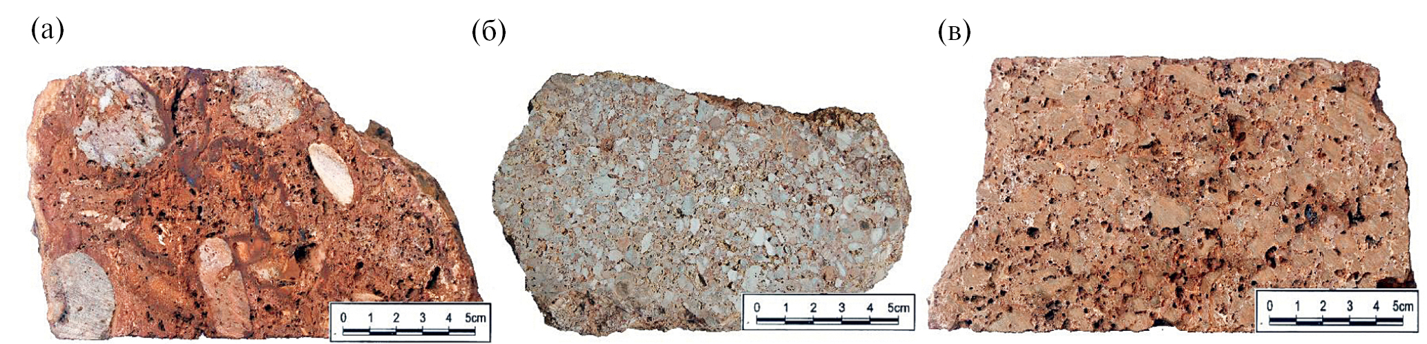 Фиг. 7. Осадочно-латеритные бокситы: а – боксит конгломератовый по отложениям серии Сангареди, б – гравелит-боксит по отложениям серии Сангареди, в – боксит песчаниковидный по отложениям серии Сангареди.