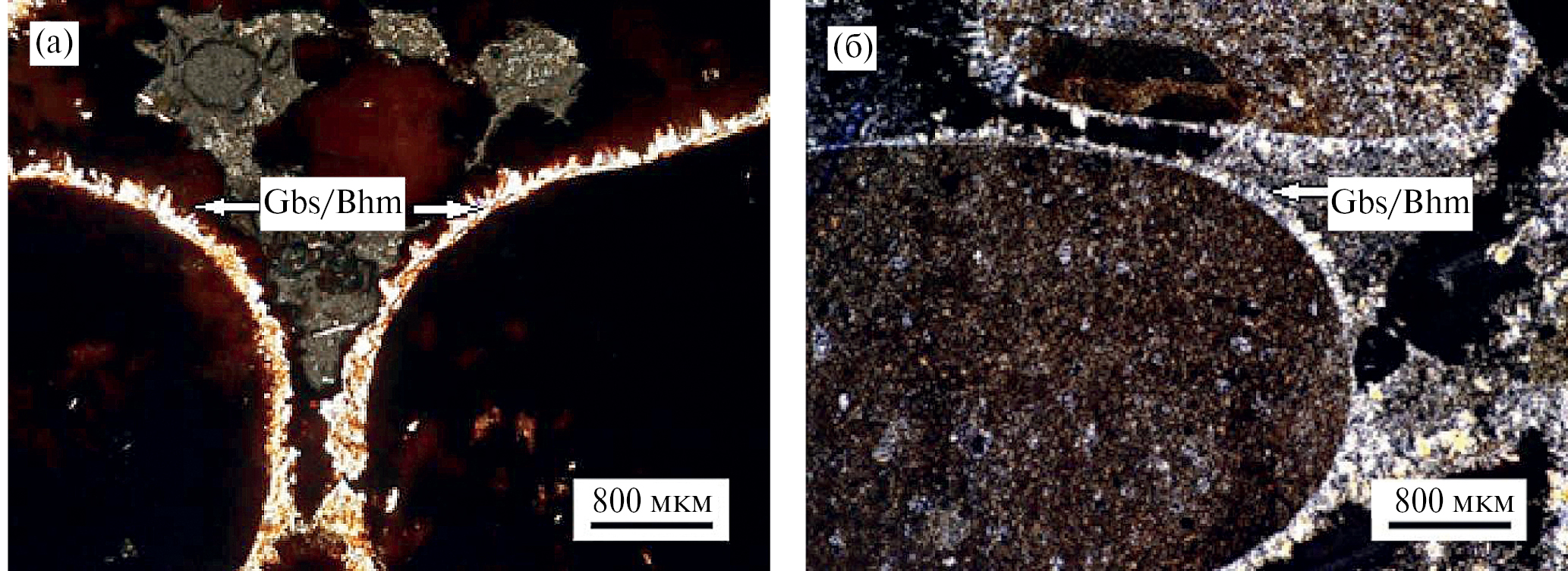 Фиг. 8. Конгломерат-бокситы: а – железистые бобовины с гиббситовыми оторочками, б – округлые обломки апоалевролитового боксита. Прозрачный шлиф (Ник. +, Gbs – гиббсит, Bhm – бёмит).
