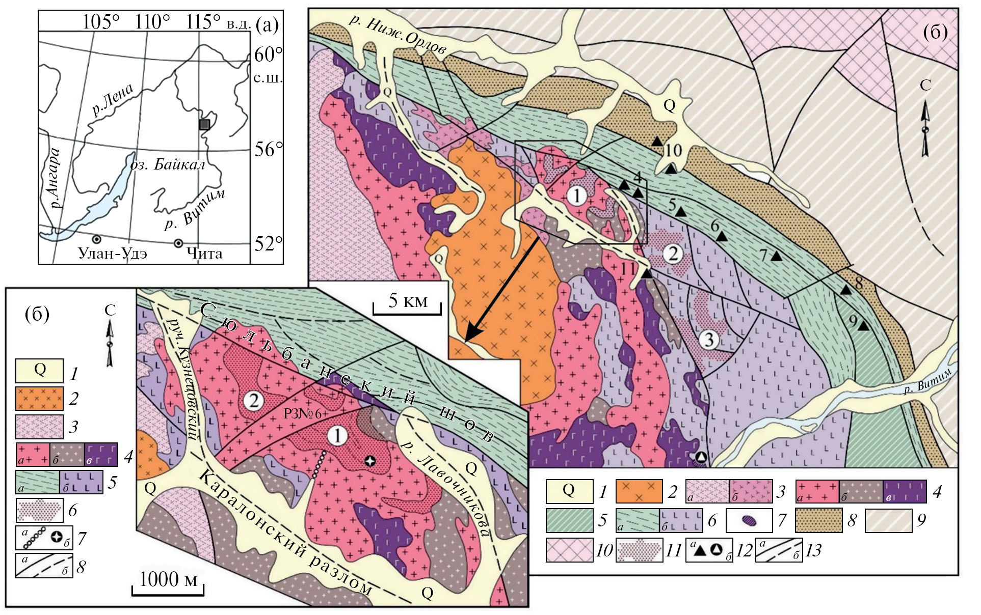 Схема (б). 1 – четвертичные отложения. Байкало-Витимский пояс (2–6): 2 – позднепермские субщелочные габбро и диориты Догалдынского интрузивного массива. Поздний эдиакарий (3–4): 3 – падринский комплекс: риолиты, базальты и вулканомиктовые отложения (а), субвулканические риолиты и гранит-порфиры (б); 4 – падоринский комплекс: cубщелочные граниты (а), плагиограниты и гранодиориты (б), габбро-диориты и габбро (в). Поздний неопротерозой (5–7): 5 – метагабброиды таллаинского комплекса, 6 – каралонская толща: нижняя осадочно-вулканогенная (а) и верхняя вулканогенная подтолщи (б), 7 – гипербазиты Усть-Каралонского массива. Сибирский кратон (8–10): Делюн-Уранская серия раннего неопротерозоя (8–9): 8 – терригенные орловская и водораздельная свиты, 9 – нерасчлененная толща усть-уряхской, уряхской и даннинской свит (карбонатные породы, углеродистые и высокоглиноземистые сланцы, параамфиболиты), 10 – метаморфические комплексы Тунгус-Дабанского выступа фундамента. Золоторудные объекты (11–12): 11 – Au-кварцево-жильное и жильно-прожилковое оруденение в пологих тектонических зонах: Верхнекаралонское месторождение (1), рудный участок Березовый (2), Еленинское месторождение (3); 12 – Au-кварцево-жильные рудопроявления в крутопадающих тектонических зонах (а): Восточное (4), Водораздельное (5), Возвратное (6), Турмалиновое (7), Конгломератовое (8), Лысое (9), Кварцевое (10), Крутое (11); (б) – Au-сульфидное рудопроявление Усть-Каралонское. 13 – важнейшие тектонические швы (а), (б) – то же, закрытые четвертичными отложениями долин.