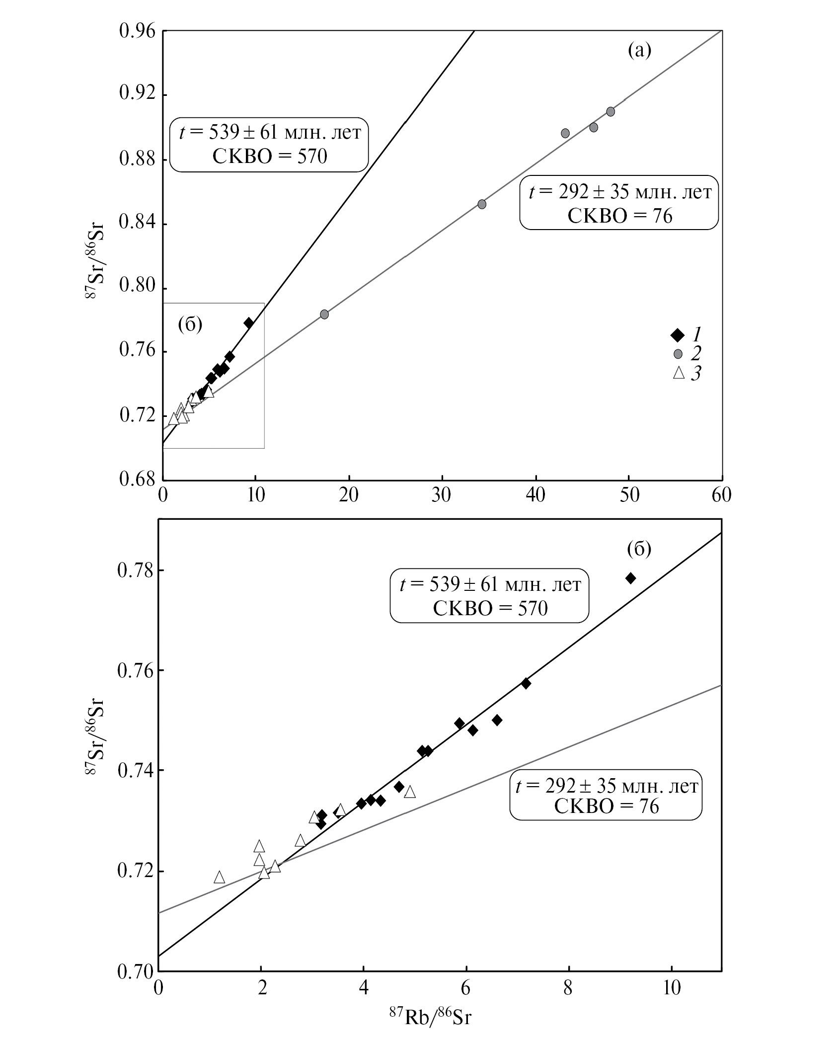 На диаграмме в координатах 87Rb/86Sr – 87Sr/86Sr точки гидротермально измененных пород с наиболее высокими Rb/Sr отношениями и высокими содержаниями Rb вместе с точками изотопного состава гидротермально измененных гранитов (Qtz–Ser–Ab) с наиболее низкими Rb/Sr отношениями и низкими содержаниями Rb, образуют единую линейную регрессию с углом наклона, соответствующим возрасту 292 ±35 млн лет (см. фиг. 2). Различные уровни содержания Rb в гидротермально измененных и неизмененных гранитах свидетельствуют о существенном перераспределении Rb в ходе гидротермально-метасоматического процесса, сопровождавшего формирование золотого оруденения.
