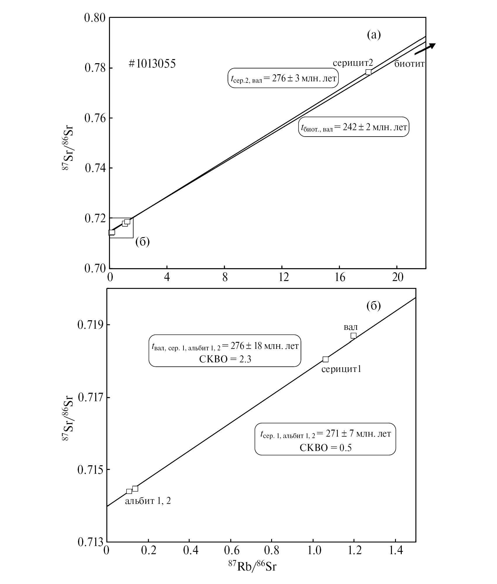 Полученные Rb–Sr изотопные данные для минералов одного из образцов (N1013055: альбит-1, альбит-2, серицит-1, серицит-2, биотит и вал) не образуют единой изохронной зависимости (см. фиг. 3). В то же время углы наклона линий, проходящих через точки вал–минерал, соответствуют возрастному интервалу 242–276 млн лет. Полученная дисперсия может быть обусловлена первичной изотопно-геохимической неоднородностью породообразующих минеральных фаз либо последовательным закрытием Rb-Sr изотопных систем в разных минералах. Вместе с тем максимальное значение возраста, полученное по Rb–Sr изотопным данным вал-серицит1-альбит1-албит2 – 276 ±18 млн лет (СКВО=2.3), согласуется с оценкой возраста, полученной ранее для околорудных метасоматитов (K–Ar, серицит, 275 ±5 млн лет, Кучеренко, 1989).