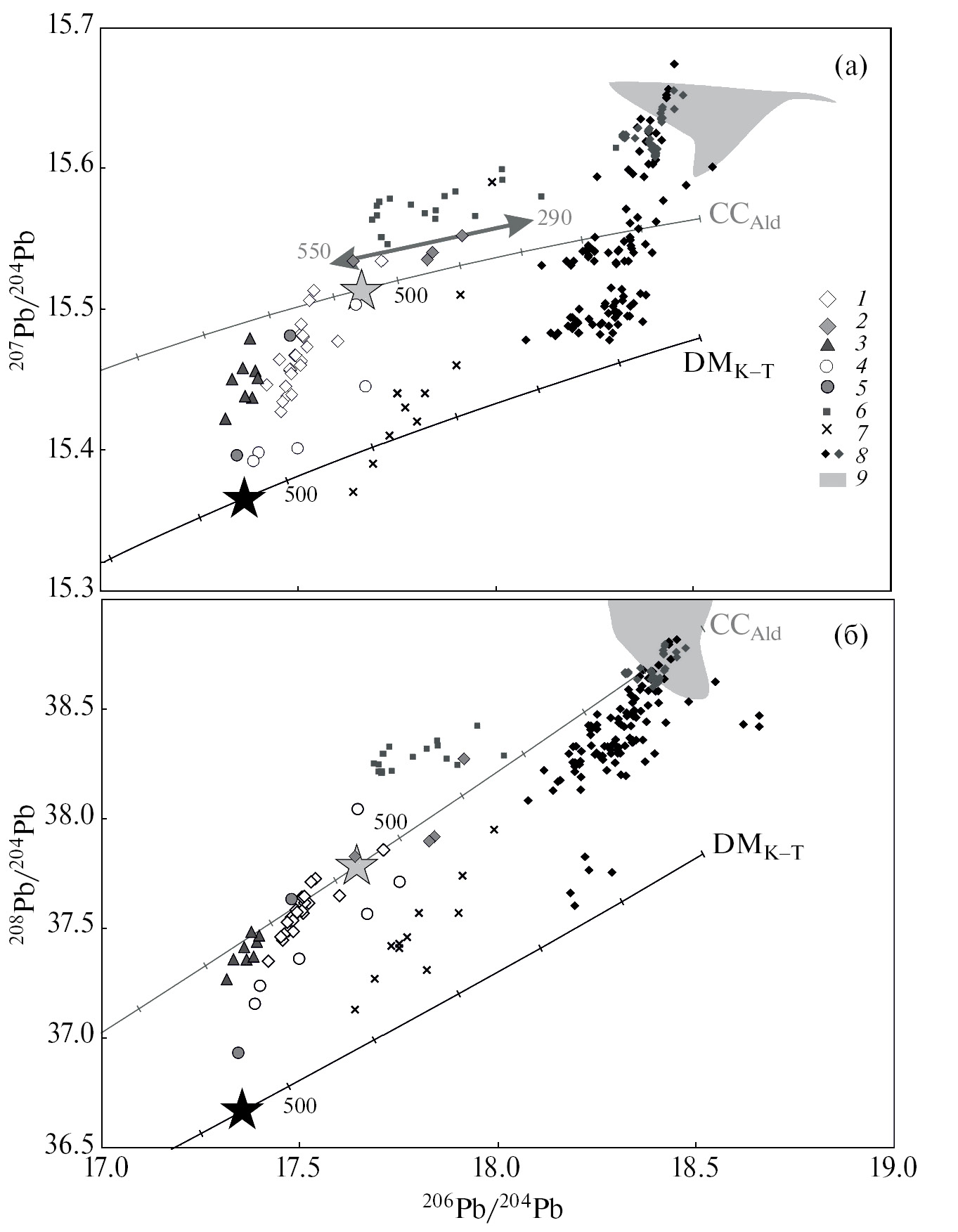 Фиг. 4. Диаграммы в координатах 206Pb/204Pb – 207Pb/204Pb (а) и 206Pb/204Pb –208Pb/204Pb (б) с данными для галенита рудных ассоциаций Каралонского рудного поля и полевых шпатов из вмещающих пород в сопоставлении с данными для рудного Pb по региону. 1–5 – Каралонское рудное поле: 1 – галенит Верхнекаралонского месторождения, 2 – галенит Водораздельной рудной зоны, 3 – галенит Еленинского месторождения и Березового участка, 4 – полевые шпаты из рудовмещающих гранитоидов, 5 – галенит из рудопроявлений Крутое и Усть-Каралонское; 6–8 – Pb–Pb данные для рудного свинца месторождений Au, Au–Ag, Pb–Zn, Sn складчатого обрамления Сибирского кратона: 6 – галенит из Уряхского рудного поля (Chugaev et al., 2022), 7 – сульфиды из месторождения Ою-Тологой (Wainwright, 2008), 8 – галениты из месторождений Приморья, имеющих позднемеловой возраст (Ростовский, 2005; Chugaev et al., 2020); 9 – раннемеловые осадочные породы Приморья (Chugaev et al., 2020). Черная линия – модельный тренд эволюции Pb в деплетированной мантии, согласно модели Крамерса–Толстихина (Kramers, Tolstikhin, 1997). Серая линия – тренд эволюции Pb в континентальной коре сибирского кратона, согласно (Ларин и др., 2021). Отрезки между штрихами на трендах отвечают интервалу 100 млн лет. Черная и серая звездочки представляют коровый и мантийный, соответственно, источники рудного Pb для Верхнекаралонского месторождения. Темно-серая линия со стрелками отвечает предполагаемому тренду перестройки Pb изотопной системы, вызванной пермской магматической активизацией.