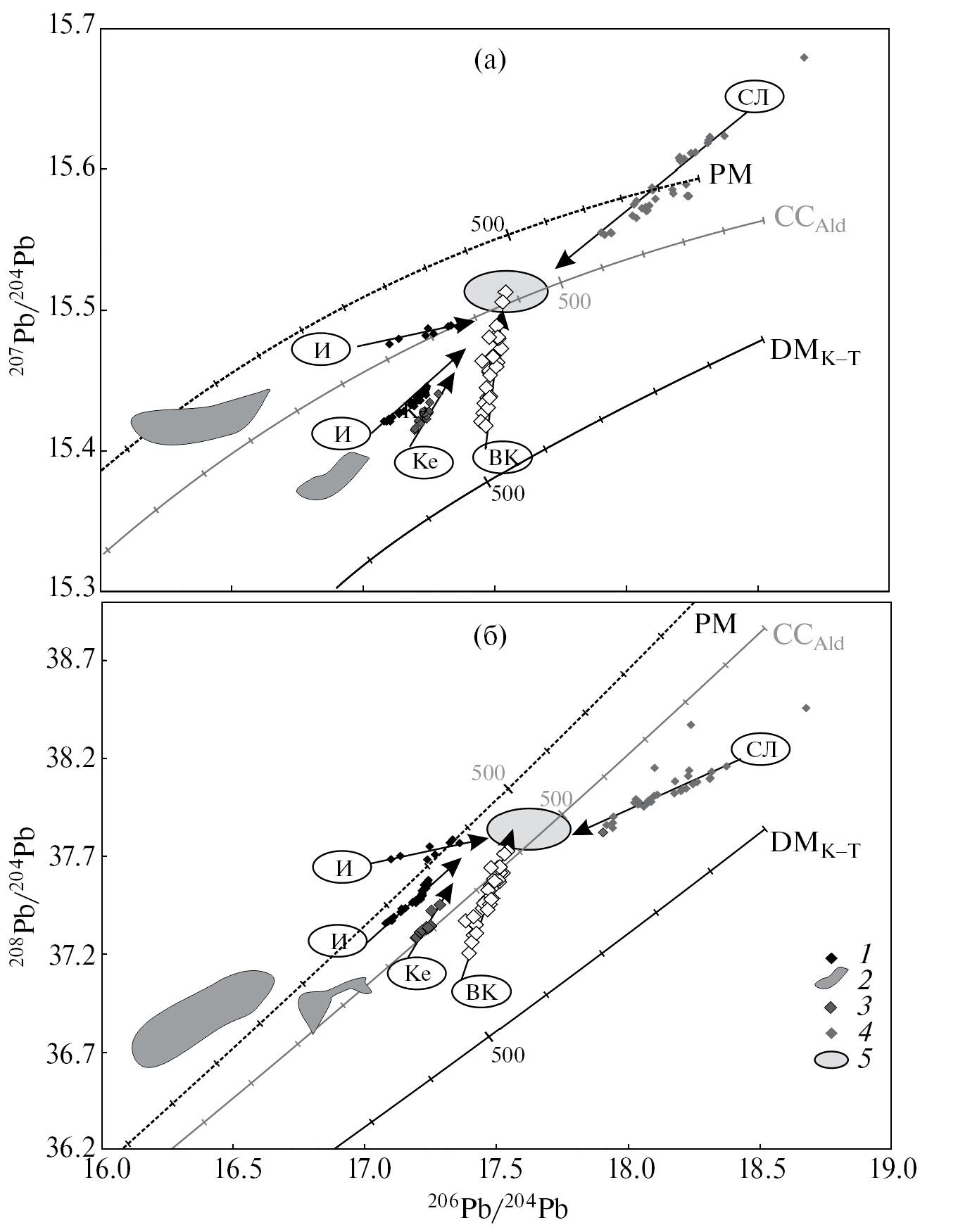 Фиг. 5. Диаграммы в координатах 206Pb/204Pb – 207Pb/204Pb (а) и 206Pb/204Pb –208Pb/204Pb (б) с данными для галенита из золоторудных месторождений Северного Забайкалья: 1, 2 – месторождение Ирокинда (И) (Чугаев и др., 2020): 1 – галенит–месторождения, 2 – вмещающие породы; 3 – месторождение Кедровское (Ке) (Чугаев и др., 2017); 4 – месторождение Сухой Лог (СЛ) (Чернышев и др., 2009); 5 – поле составов общего компонента для рудного Pb Северного Забайкалья. ВК – Верхнекаралонское месторождение (эта работа). РМ – модельный тренд эволюции Pb в примитивной мантии (Kamber, Collerson, 1999). Остальные обозначения те же, что и на фиг. 4.