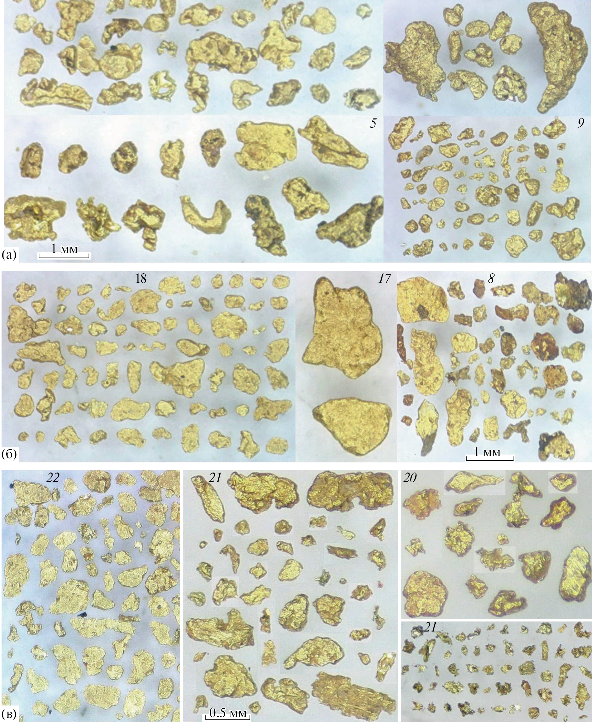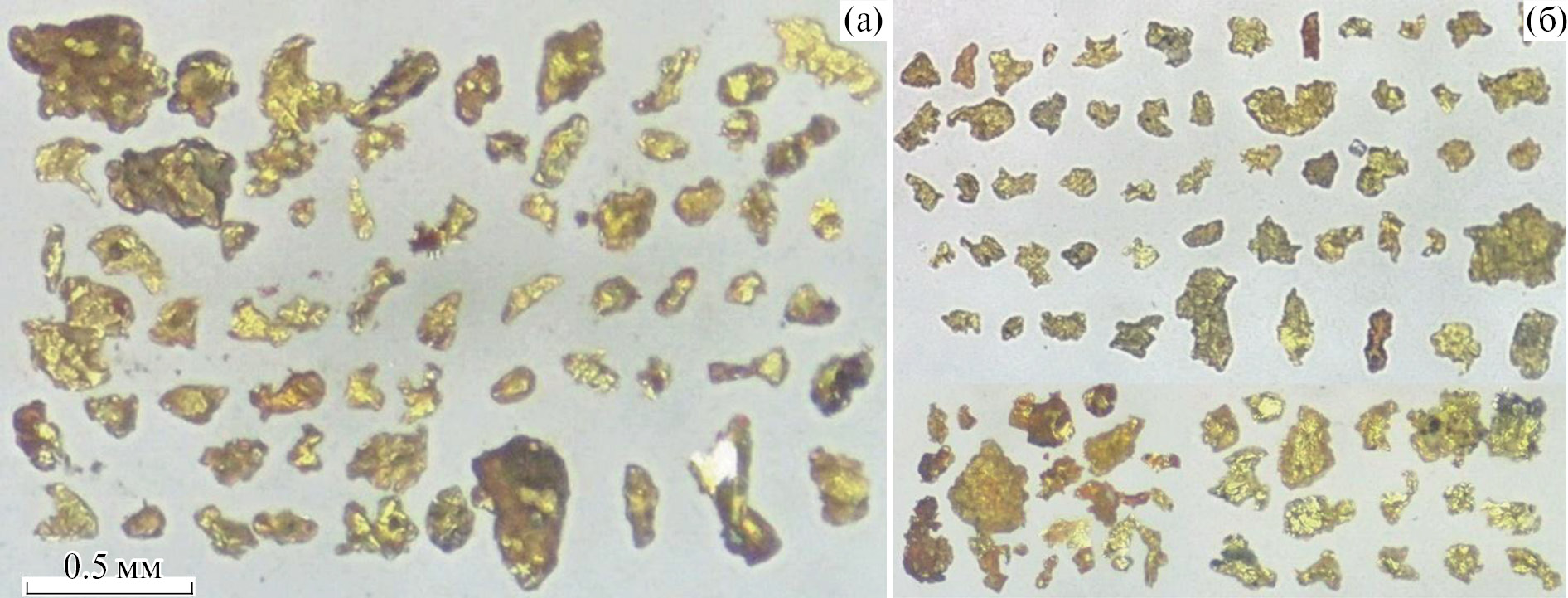 Также распространены золотины массивной и кристаллоподобной морфологии. Сильно уплощенные чешуйчатые и лепешковидные формы Au более характерны для участков россыпей в нижнем течении рек Давенда (13), Кудечи (14). Уплощенное, окатанное золото (“косовое”) преобладает в россыпях р. Горбичанка (17, 18, см. фиг. 2б) и ее безымянного правого притока (19). В пробе 17 встречены и более массивные, размером до 3 мм, окатанные золотины. В количественном отношении во всех пробах преобладают золотины размером от 0.1 до 0.5 мм, выход тонкого (менее 0.1 мм) Au не превышает 10–15%, а выход золота крупнее 0.5 мм составил от 5 до 20%, лишь в пробах 5 и 17 – 45% и 32% соответственно. Россыпь рч. Малый Боровой (5) целиковая, автохтонная, не затронутая промышленной старательской отработкой. Проба отбиралась непосредственно с трещиноватого плотика, сложенного гранитами, содержание золота составило порядка 10 г/м3.