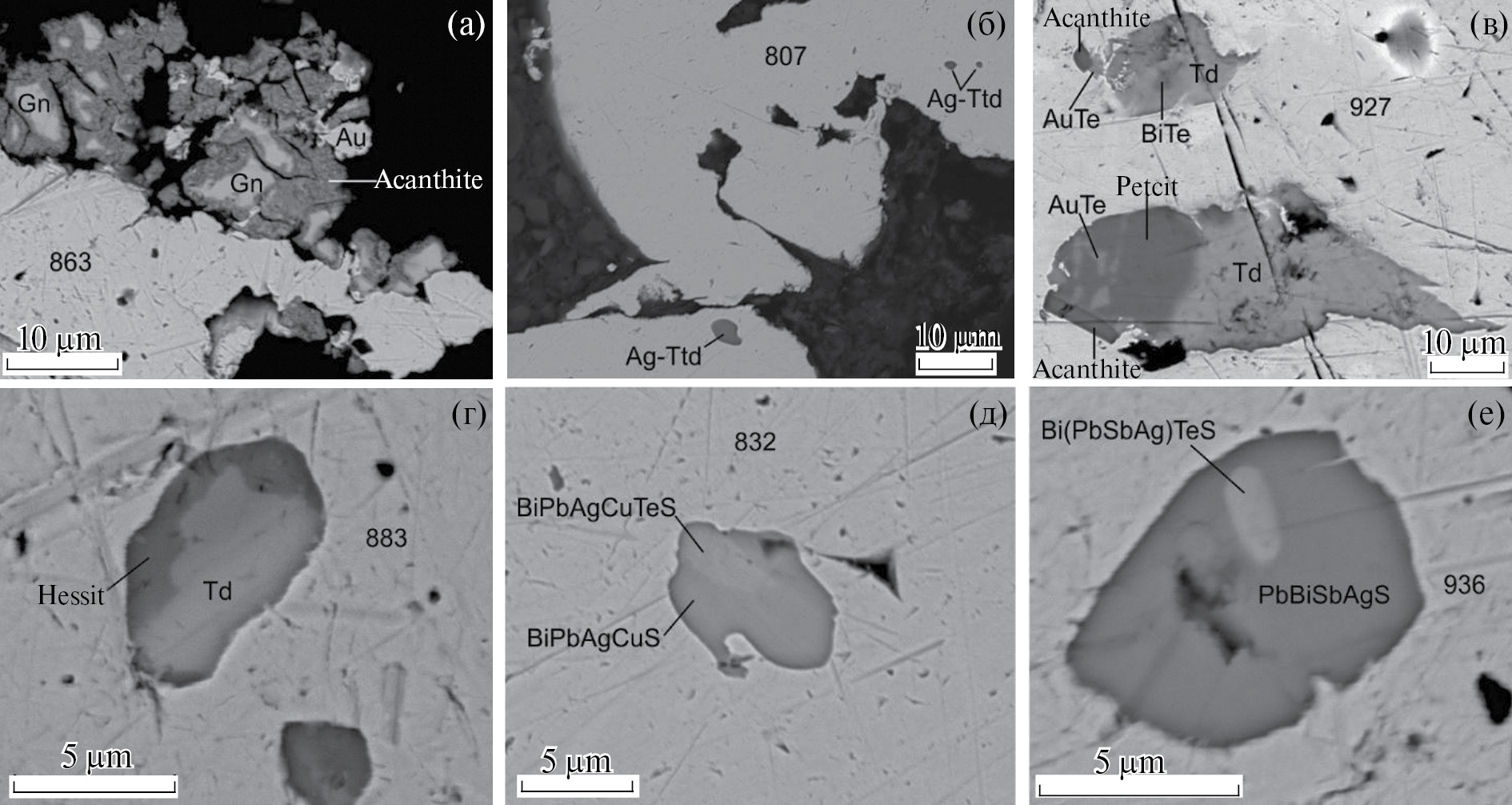 SEM-изображения. а, г–е – проба 21, б – проба 20, в – проба 22. Минералы: Gn – галенит, Ag–Ttd – Ag-содержащий тетраэдрит, Td – тетрадимит. Цифрами на фотографиях обозначена пробность золота.