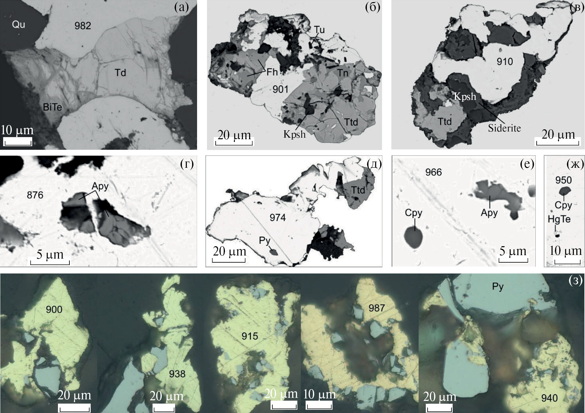 SEM-изображения и фотографии под рудным микроскопом. Минералы: Qu – кварц, Td – тетрадимит, Tn – теннантит, Ttd – тетраэдрит, Fh – блеклая руда ряда Tn–Ttd, Tu – турмалин, Кпш – калиевый полевой шпат, Py – пирит, Apy – арсенопирит, Cpy – халькопирит. Цифрами на фотографиях обозначена пробность золота.