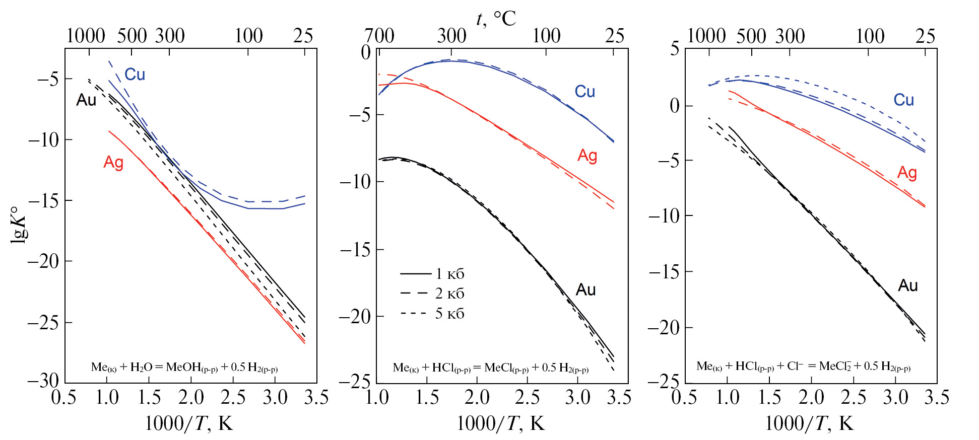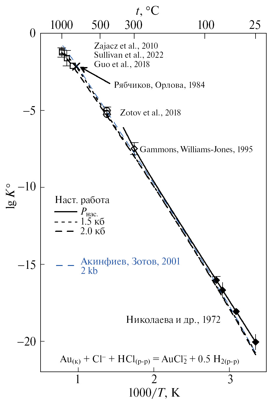 В работе (Gammons, Williams-Jones, 1995) определена растворимость сплава Ag-Au + AgCl(к) в растворах HCl + NaCl при 300 °С, Рнас.. Окислительный потенциал в этой системе задавался составом сплава и контролировался реакцией Agсплав + C1– + H+ + 0.25 О2(г) = AgCl(к) + 0.5 H2О. Концентрация соляной кислоты менялась от 0.1 до 5 m. Серия опытов выполнена в системе с переменным отношением концентраций HCl/NaCl, от 0.01 m HCl + 3 m NaCl до 2 m HCl + 1 m NaCl. Авторы установили, что во всех экспериментальных растворах основным комплексом Au является AuCl2−, и определили константу образования этого комплекса. Мы считаем эти данные наиболее надежными в области температур от 100 °С до критических PT-параметров H2О и будем использовать их в качестве опорной точки.