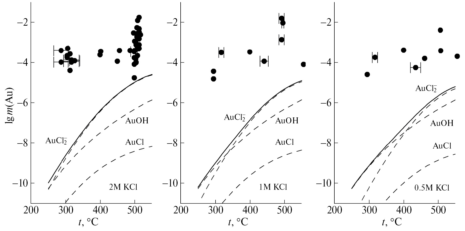 Хлоридные комплексы Au – основная форма переноса этого металла высокотемпературными гидротермальными флюидами (Williams-Jones et al., 2009). Количественное описание механизмов образования золоторудных месторождений основано на термодинамических моделях комплексообразования Au. Последняя компиляция значений термодинамических свойств хлоридных комплексов Au в водных растворах выполнена более двадцати лет назад (Акинфиев, Зотов, 2001). Со времени этой публикации появились работы, которые позволяют существенно расширить диапазон PT-параметров термодинамической модели (Zajacz et al., 2010; Guo et al., 2018; Sullivan et al., 2022). Сводка значений термодинамических свойств хлоридных комплексов Au (Акинфиев, Зотов, 2001) основана на экспериментальных данных (Зотов и др., 1989, 1990). Разница значений констант растворения Au с более поздней экспериментальной работой (Stefánsson, Seward, 20031) при одинаковых PT-параметрах составляет до 1.5 л.е., причем расхождение увеличивается по мере роста температуры. Эти разногласия побудили нас выполнить дополнительную работу по изучению хлоридного комплексообразования Au в промежуточной области температур и давлений, 450 °С, 500–1500 бар (Zotov et al., 2018). Результаты этой работы показали, что истинные значения растворимости Au находятся между данными (Зотов и др., 1989, 1990) и (Stefánsson, Seward, 20031), а это значит, что термодинамическая база данных (Акинфиев, Зотов, 2001) нуждается в ревизии.
