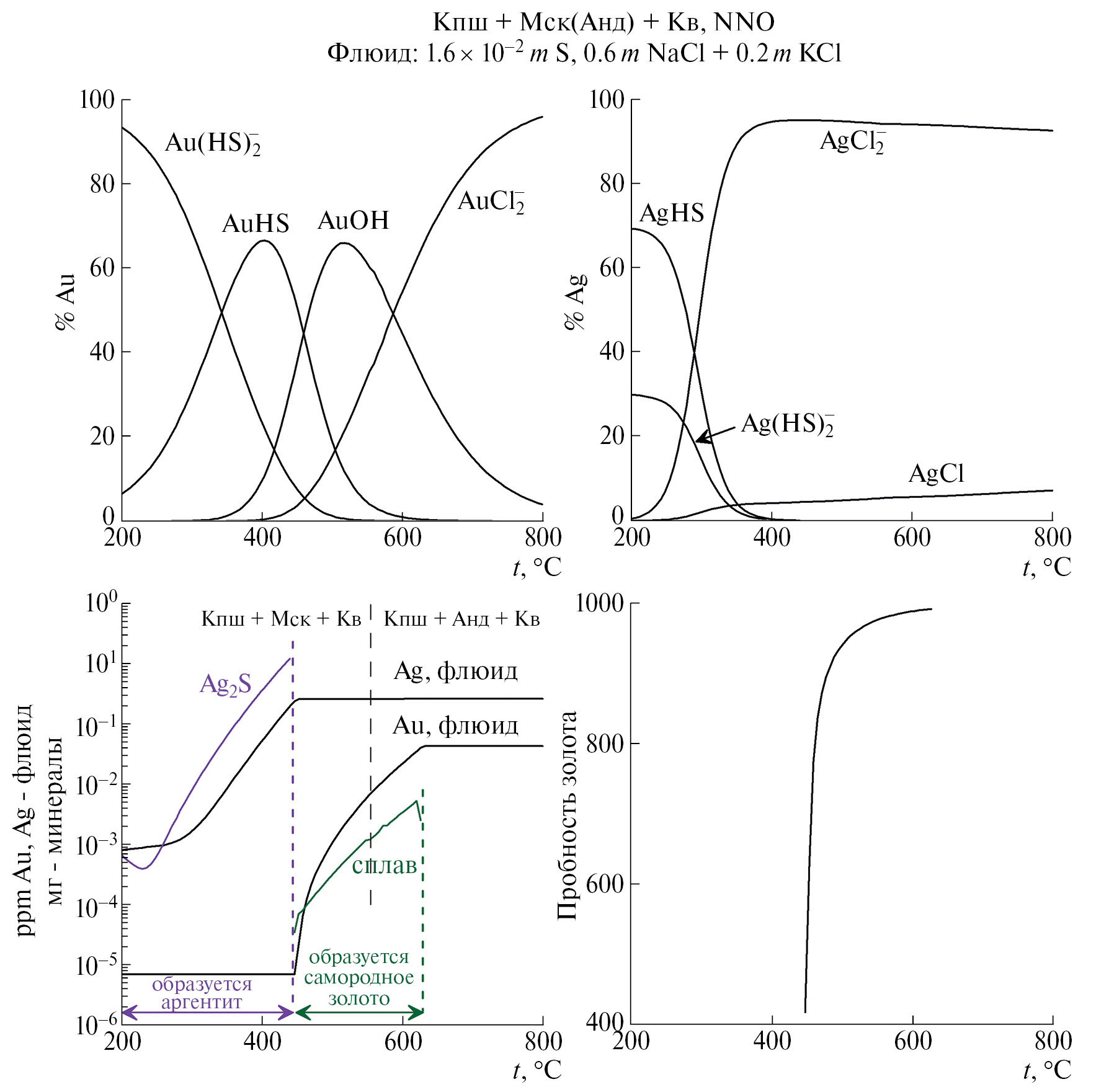 В качестве примера использования полученных данных для моделирования гидротермальных процессов мы выполнили расчет состава системы, состоящей из флюида, содержащего Au и Ag, находящегося в равновесии с минеральной ассоциацией калиевый полевой шпат – мусковит (андалузит) – кварц (фиг. 8). Окислительный потенциал системы отвечает буферной паре никель – бунзенит. Температура меняется от 800 до 200 °С, давление линейно снижается от 3000 до 500 бар. Концентрация Au в исходном флюиде составляет 500 ppb (по данным (Ulrich et al., 1999) С(Au) = 790 ±390 ppb для Cu-Mo-Au порфирового месторождения Bajo de la Alumbrera), отношение концентраций Ag/Au (ppm) = 56 задано согласно (Ulrich et al., 1999). Общая концентрация хлоридов составляет 0.8 m (0.6 m NaCl + 0.2 m KCl). Концентрация серы определена как S/Cl = 0.2. Как видно из результатов расчета, при температуре 800–600 °С основным комплексом Au является AuCl2–, который при охлаждении последовательно сменяется комплексами AuOH(p-p) – AuHS(p-p) – Au(HS)2–. Для Ag ведущим является комплекс AgCl2– вплоть до 290 °С, где основной формой становится AgHS(p-p). Отложение высокопробного самородного золота начинается при 640 °С, и вплоть до 500 °С пробность составляет 990–940. В этом диапазоне температуры концентрация Au во флюидной фазе падает в ~ 40 раз. Дальнейшее охлаждение приводит к еще более сильному снижению концентрации растворенного Au, которому отвечает резкое падение пробности самородного золота вплоть до 420 при 445 °С, когда образование сплава прекращается. При более низкой температуре образуется аргентит, из-за чего концентрация растворенного Ag начинает резко снижаться. Смешанные сульфиды Au и Ag (Ag (петровскаит, ютенбогаардтит) не образуются. Таким образом, при заданном составе системы состав твердых фаз меняется в порядке высокопробное золото – низкопробное золото – аргентит.